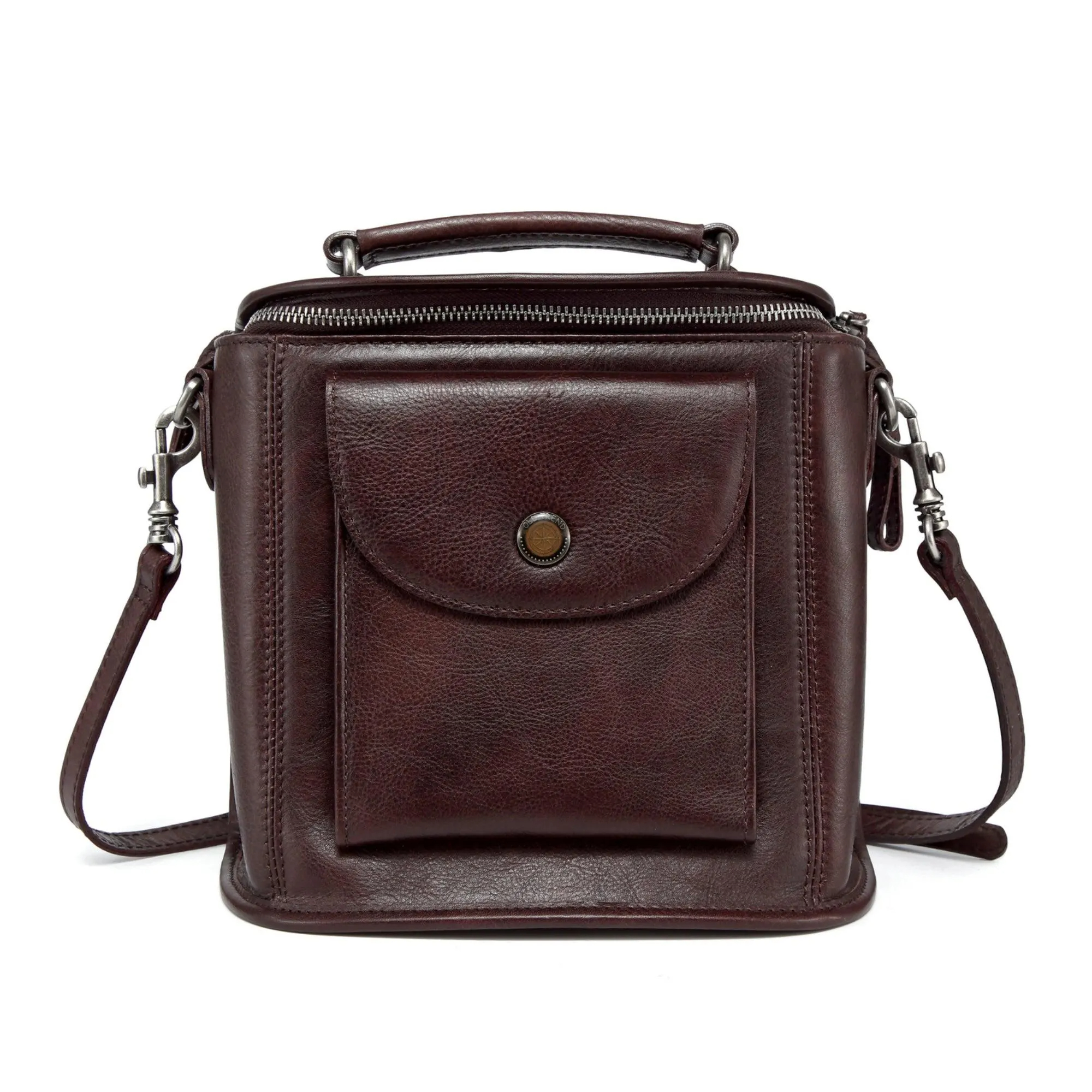 Front Pocket & Hardware: The front flap pocket, embellished with a vintage metal buckle, offers both decorative and practical storage for small items like a phone and keys. The bag boasts delicate hand-stitching and sleek edges, reflecting the meticulous craftsmanship of handmade leather goods in every detail.
