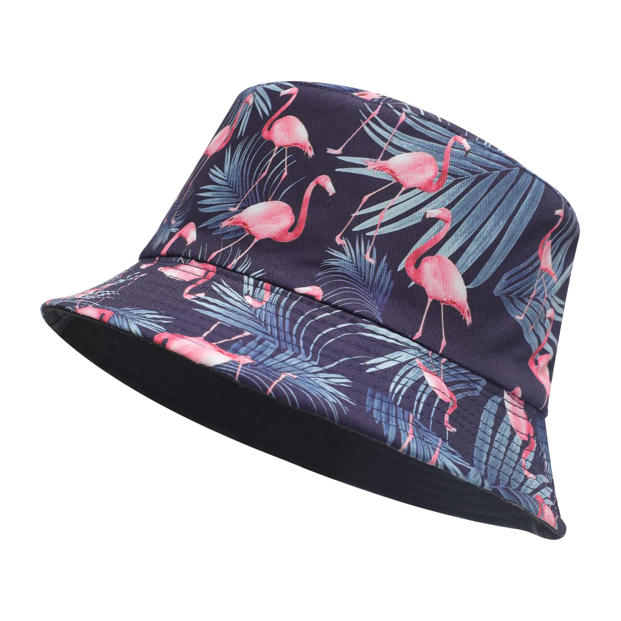 With its deep sea blue base adorned with pink flamingos and lush palm leaves, this bucket hat instantly creates a strong vacation vibe. It transforms a simple T-shirt and shorts outfit into a complete summer look.