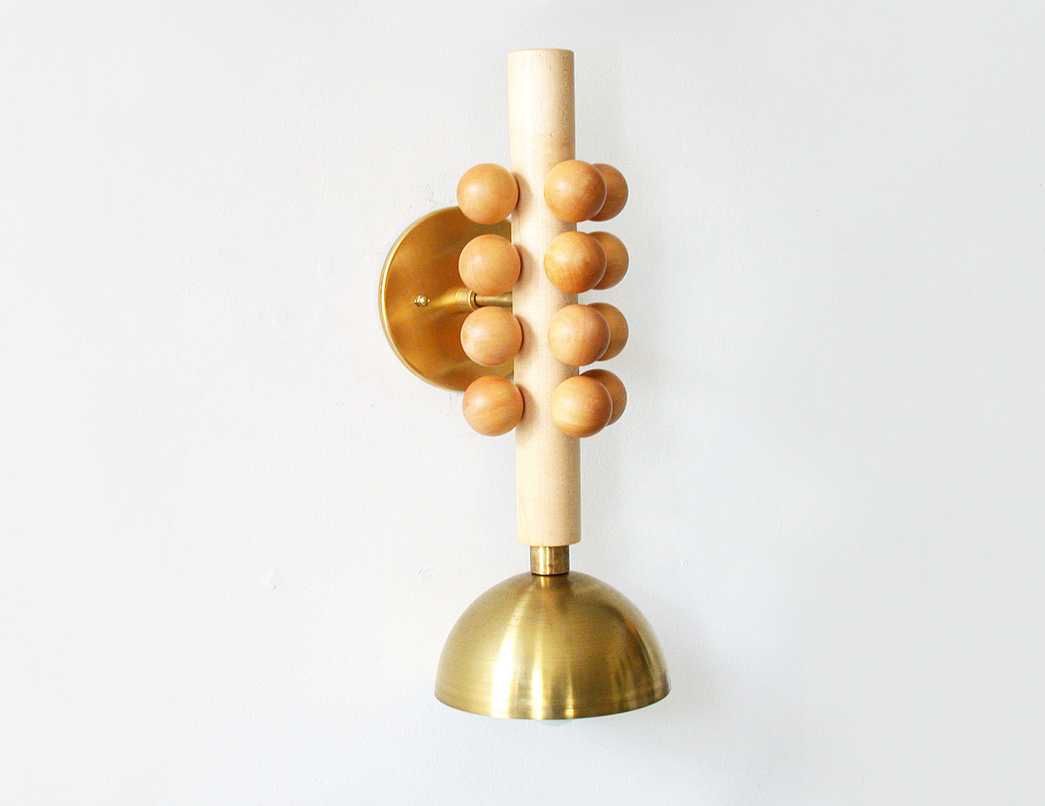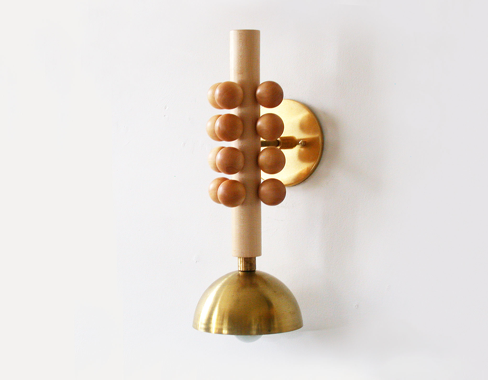 – A sculptural vertical column wrapped in wooden beads, paired with a brushed brass half-dome shade, creates a warm, focused light.