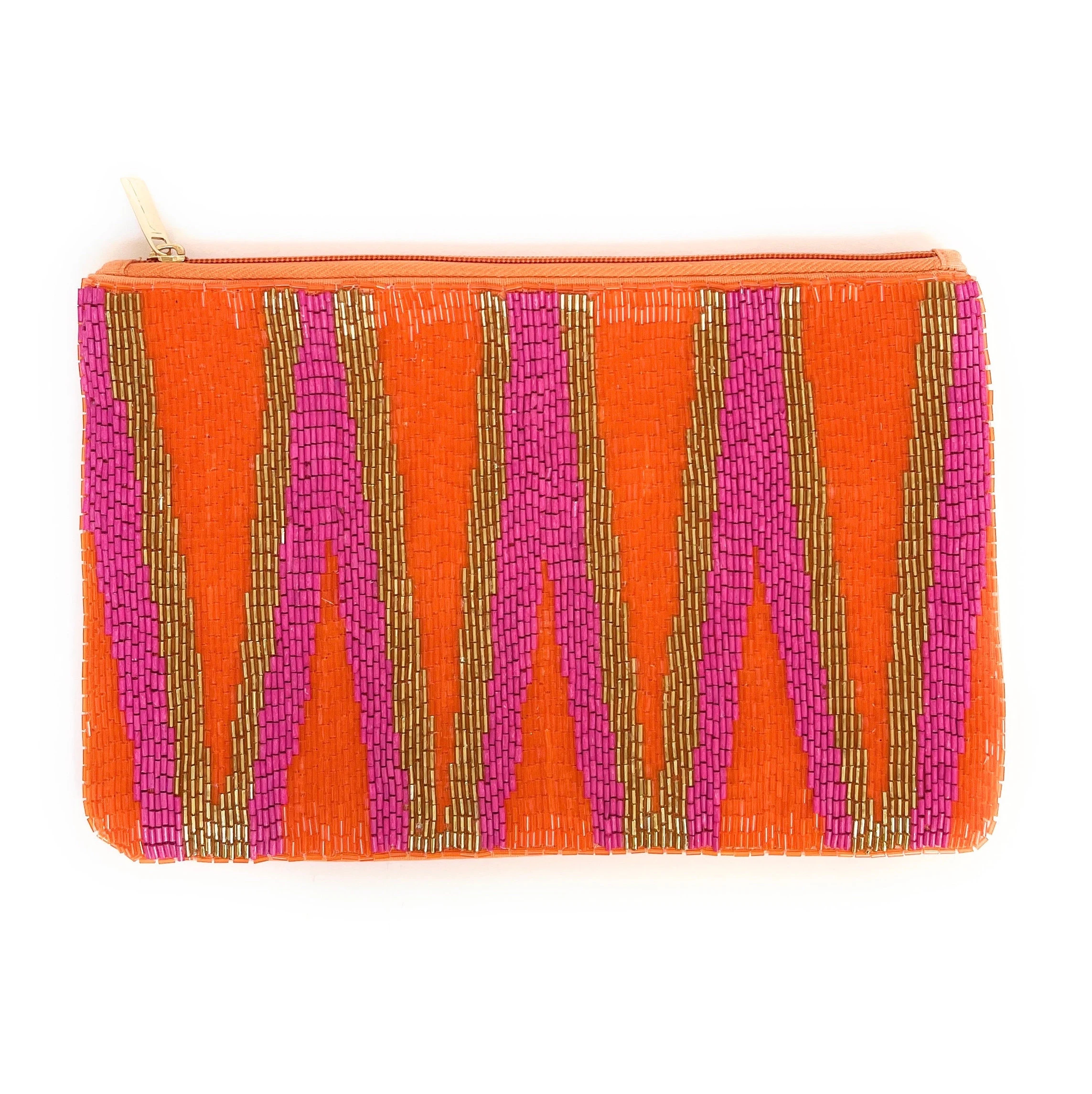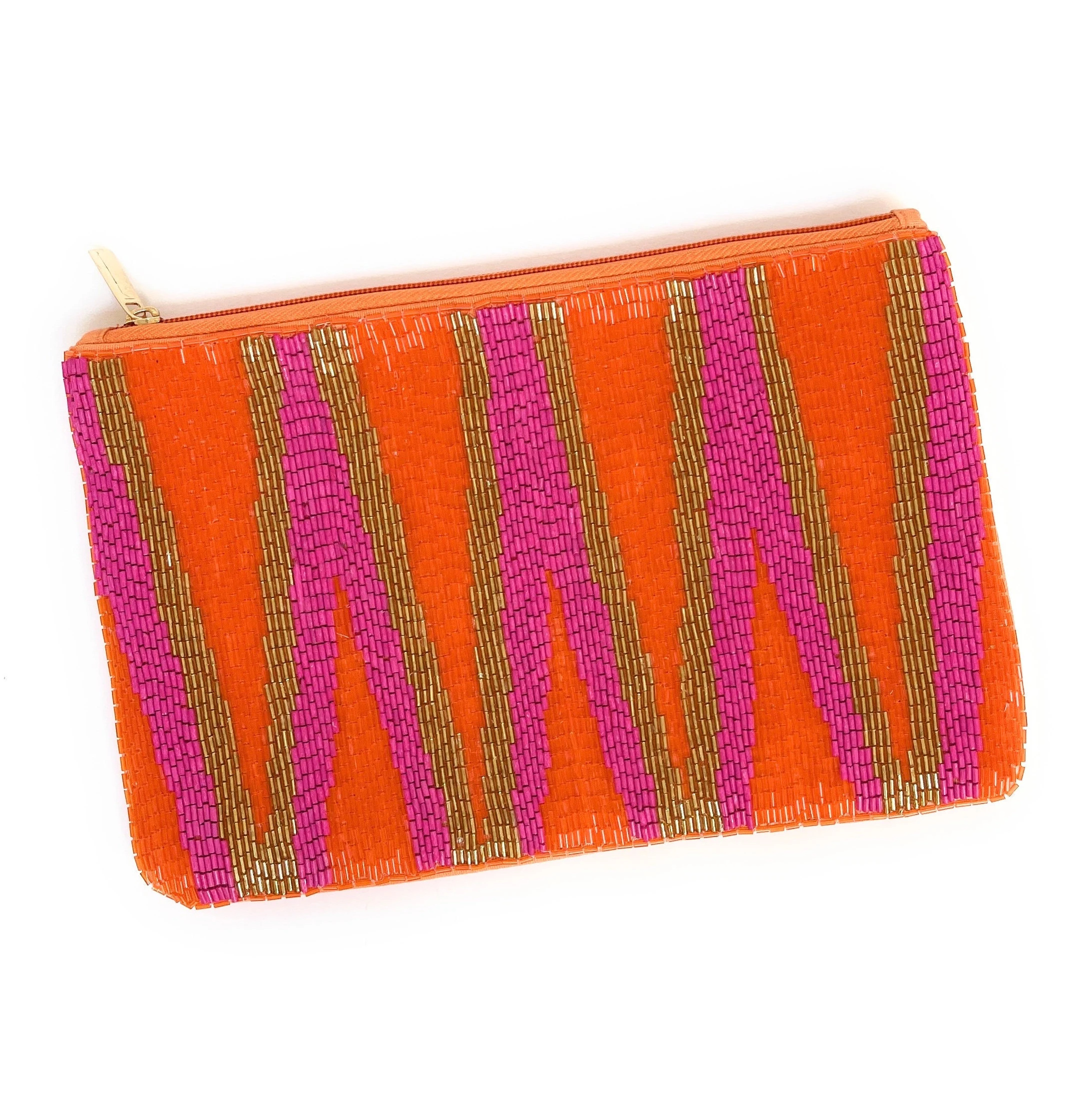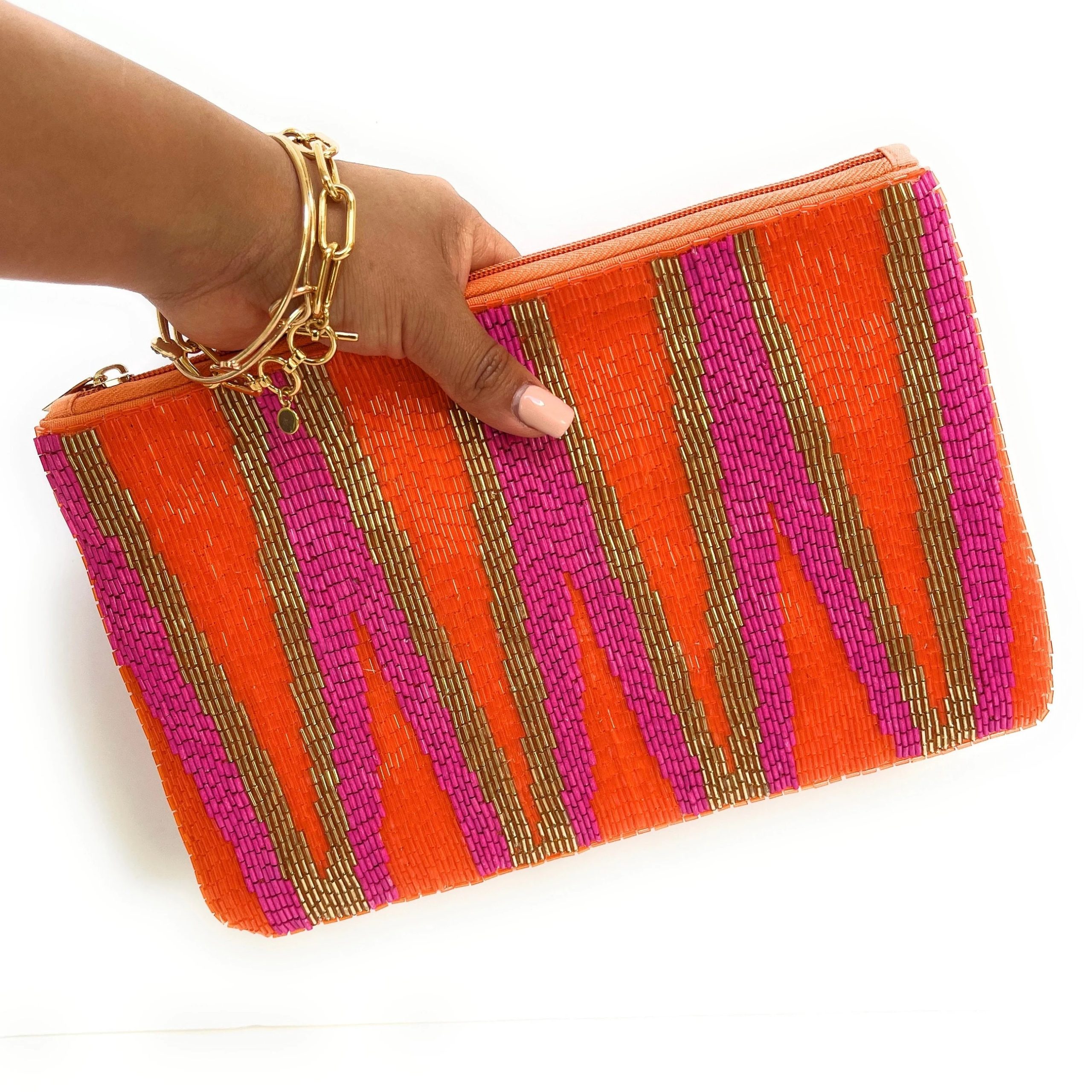 Inspired by the retro geometric aesthetic of the 1970s, this bold trio of vibrant orange, retro pink, and metallic gold creates a rhythmic pattern of ivory stripes. It exudes the vibrant energy of retro disco while infusing a trendy vibe with modern beading techniques. It’s a perfect choice for retro lovers and color enthusiasts.