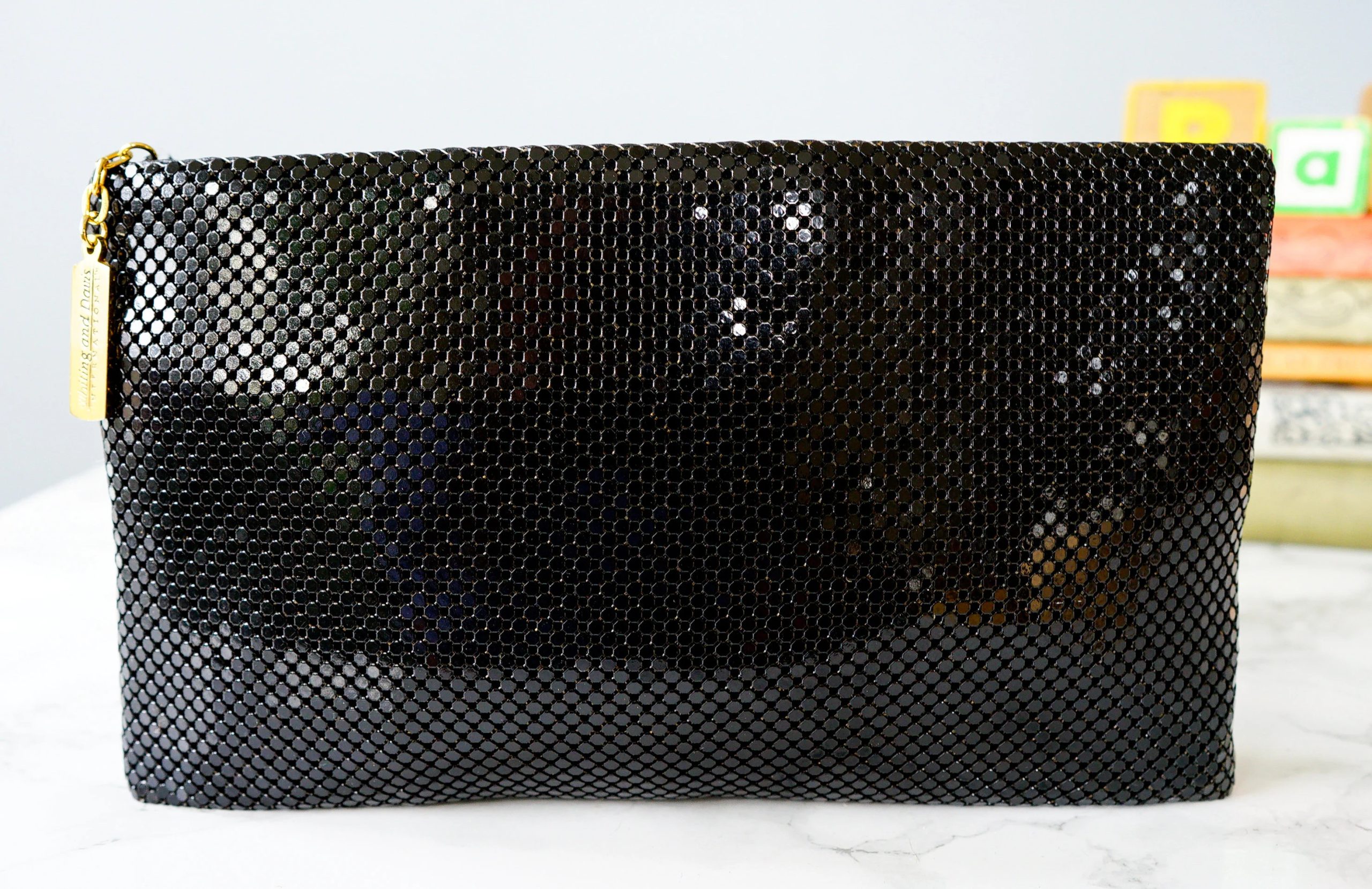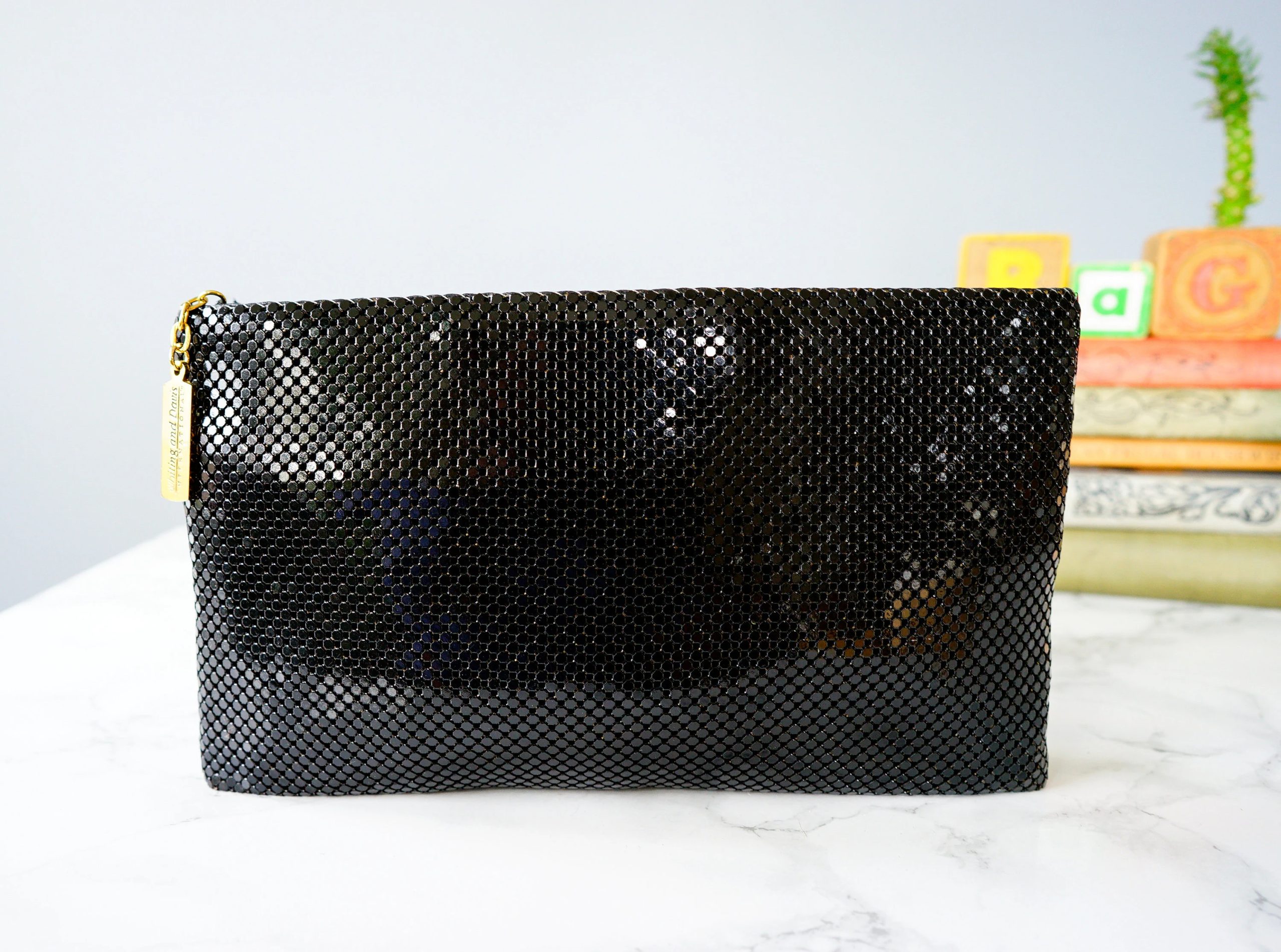 Modern Black and Gold: A black satin slip dress paired with a metal mesh clutch. The smoothness of satin meets the cool texture of metal. Paired with gold geometric earrings, this creates a high-end evening look that blends retro and modern.