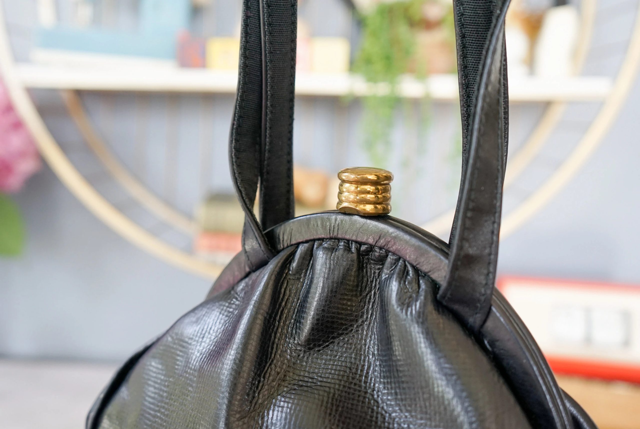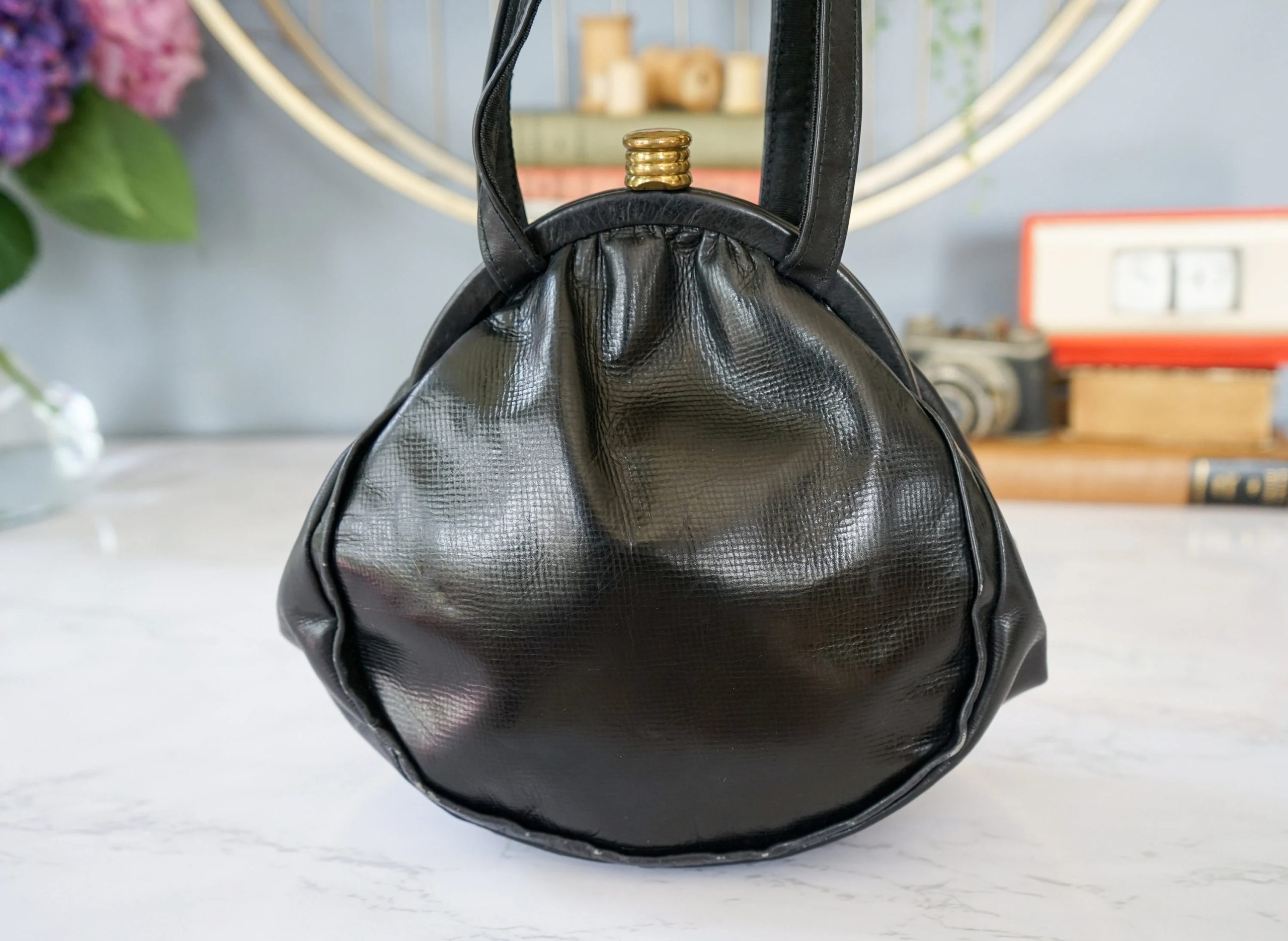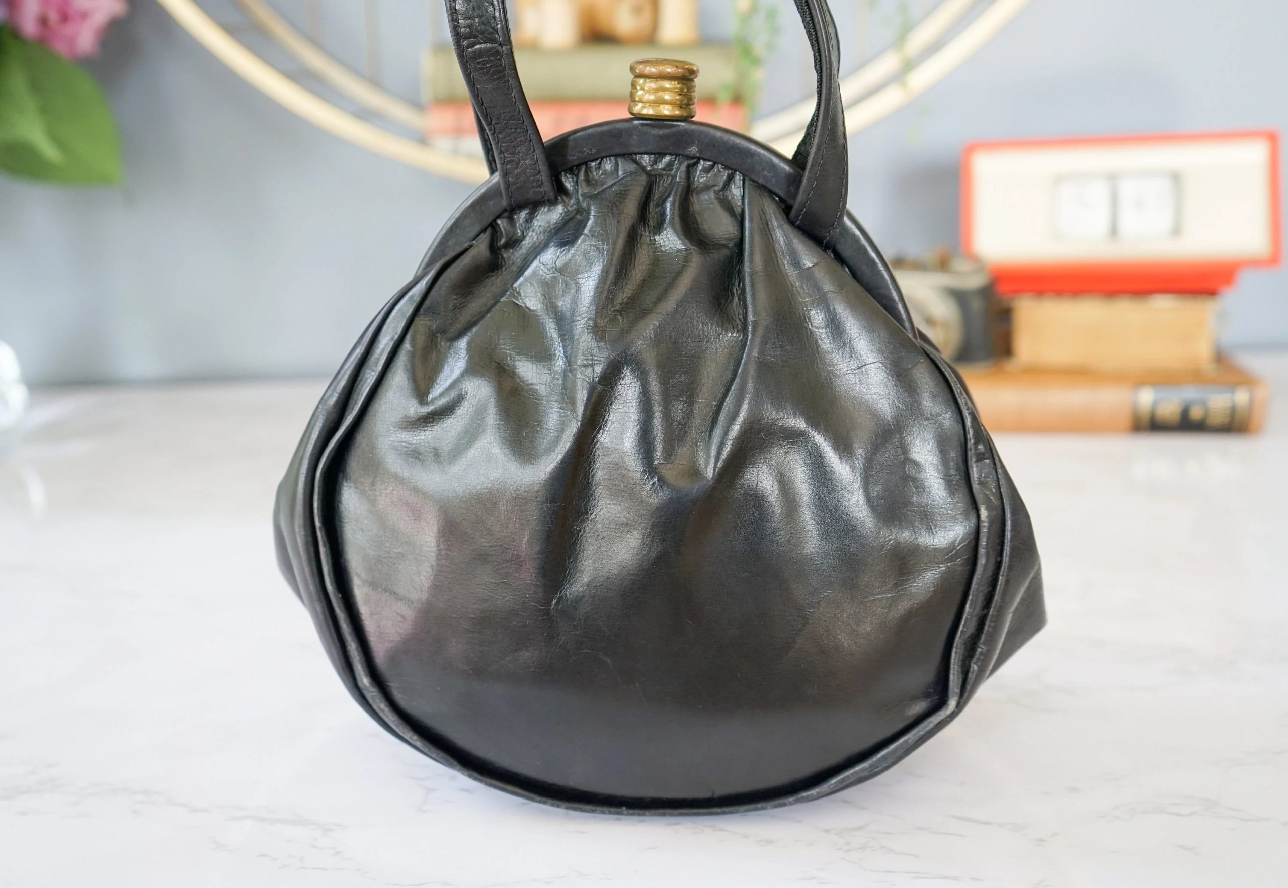 For a casual evening/retro party: Paired with a black satin gown or burgundy velvet skirt, the elegant rounded silhouette complements the vintage texture of black leather. A handbag instantly becomes the centerpiece of your look, creating an eye-catching “retro diva” look.