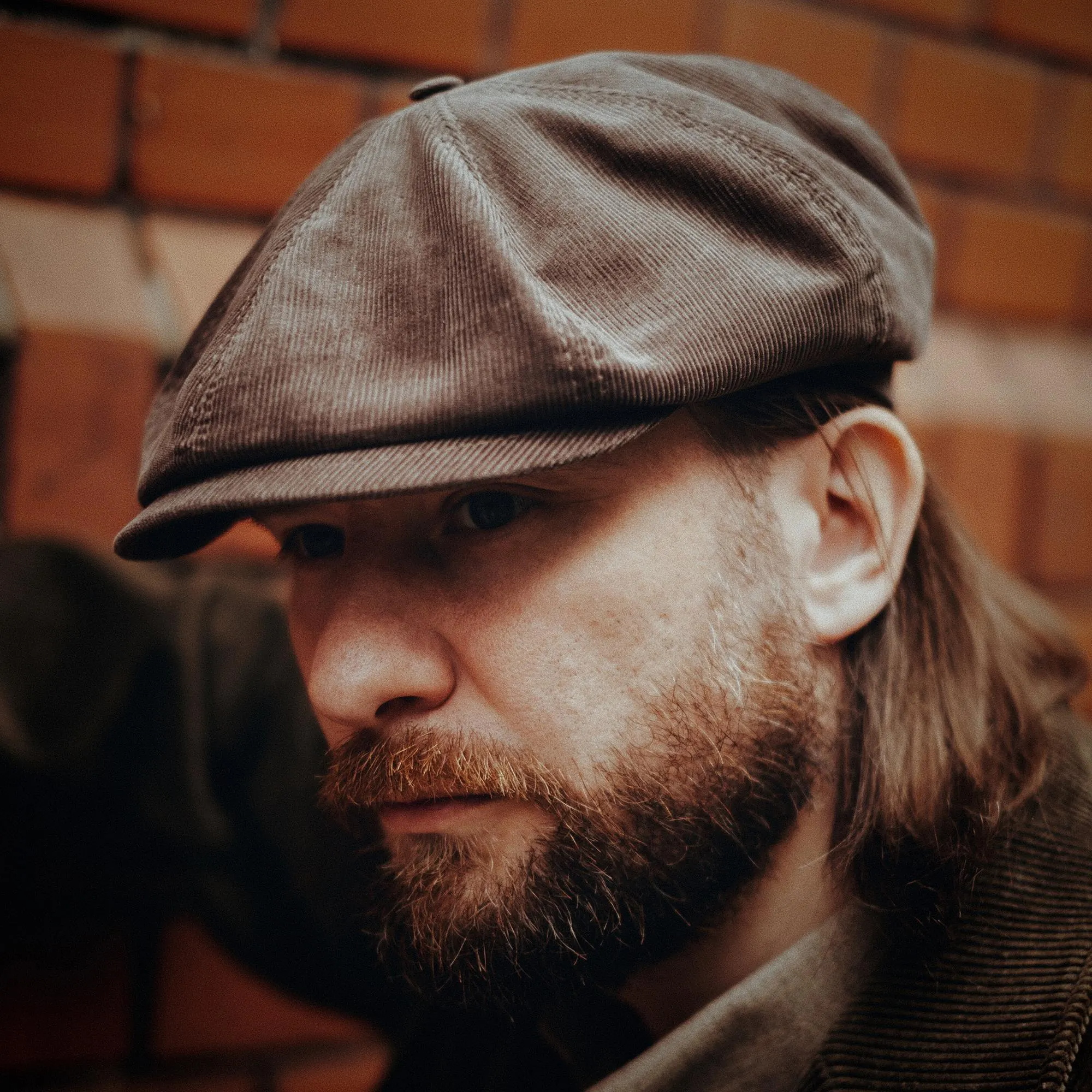 Retro Men’s Look: Paired with a denim jacket, vintage sweater, straight-leg overalls, and Doc Martens boots, the corduroy newsboy cap echoes the denim and workwear elements, and the dark gray hue blends seamlessly with the overall retro palette, creating a stylish look imbued with a bygone era.