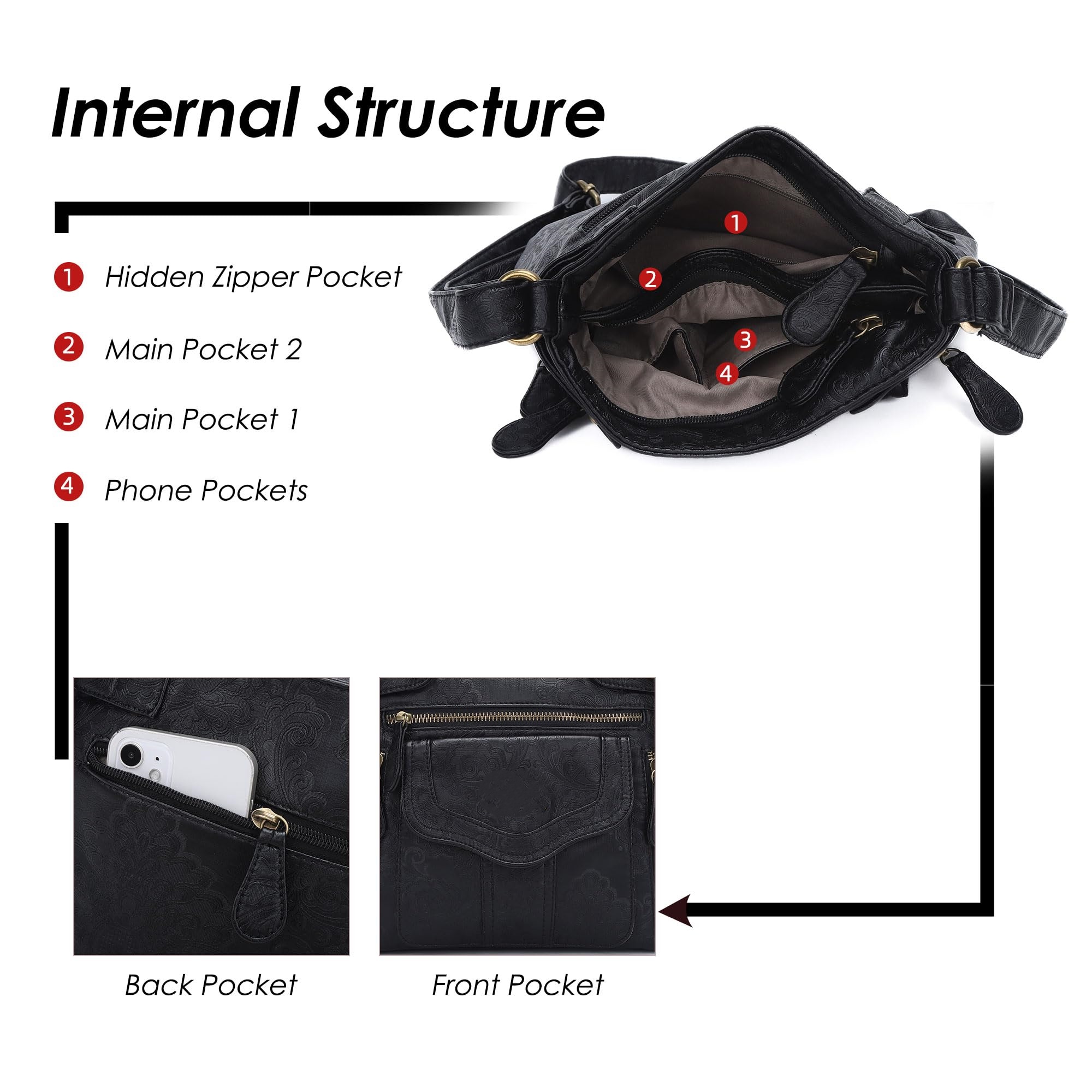 Combined with black embossed leather and accented with exquisite metal hardware, it blends vintage elegance with style. The multi-pocket design is perfect for everyday commuting, shopping, and more, allowing for flexible shoulder or crossbody carry. This bag blends vintage elegance with practical functionality, adding a unique touch to any outfit and easily becoming a stylish statement piece on the go.