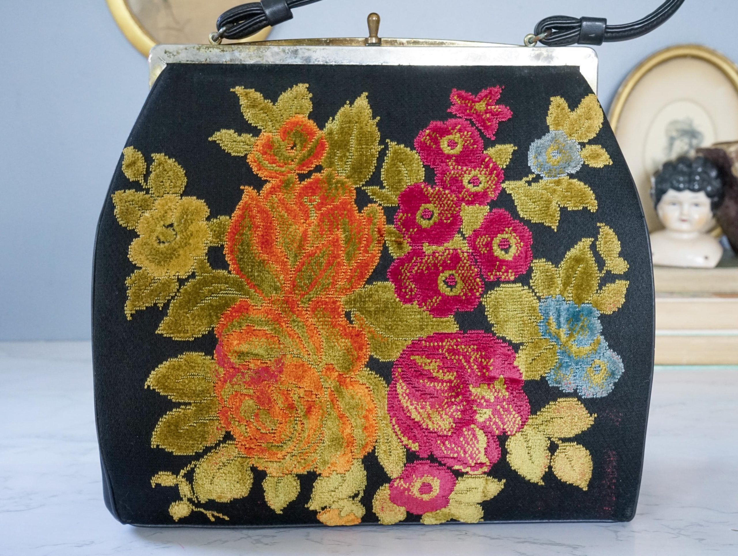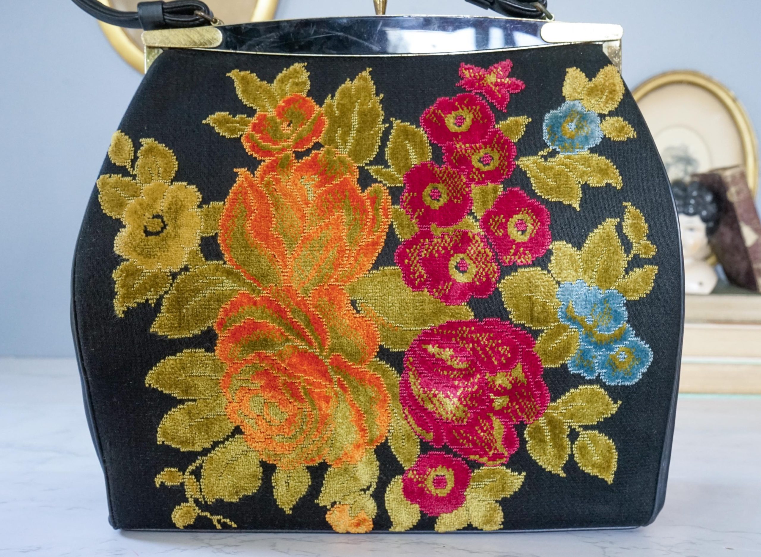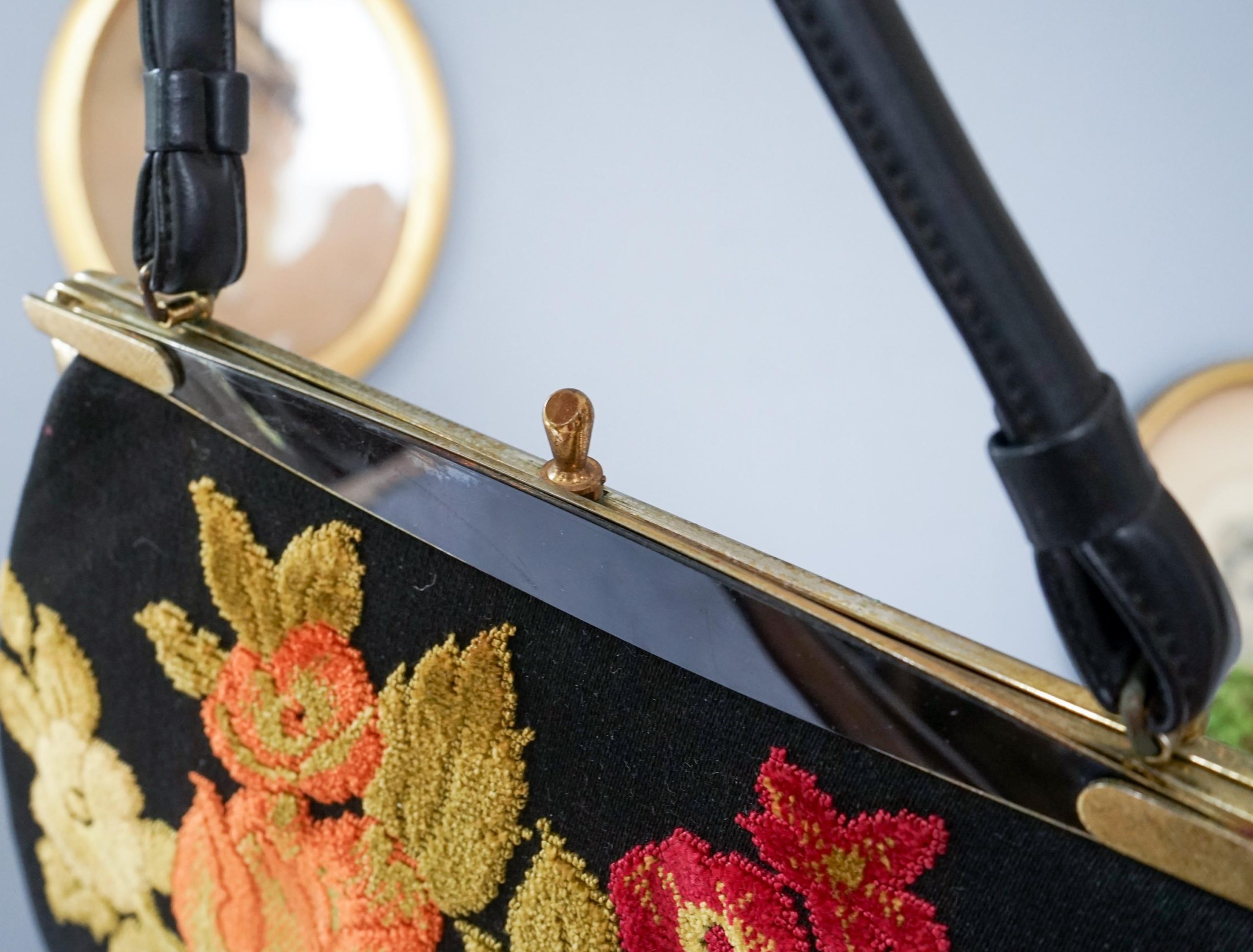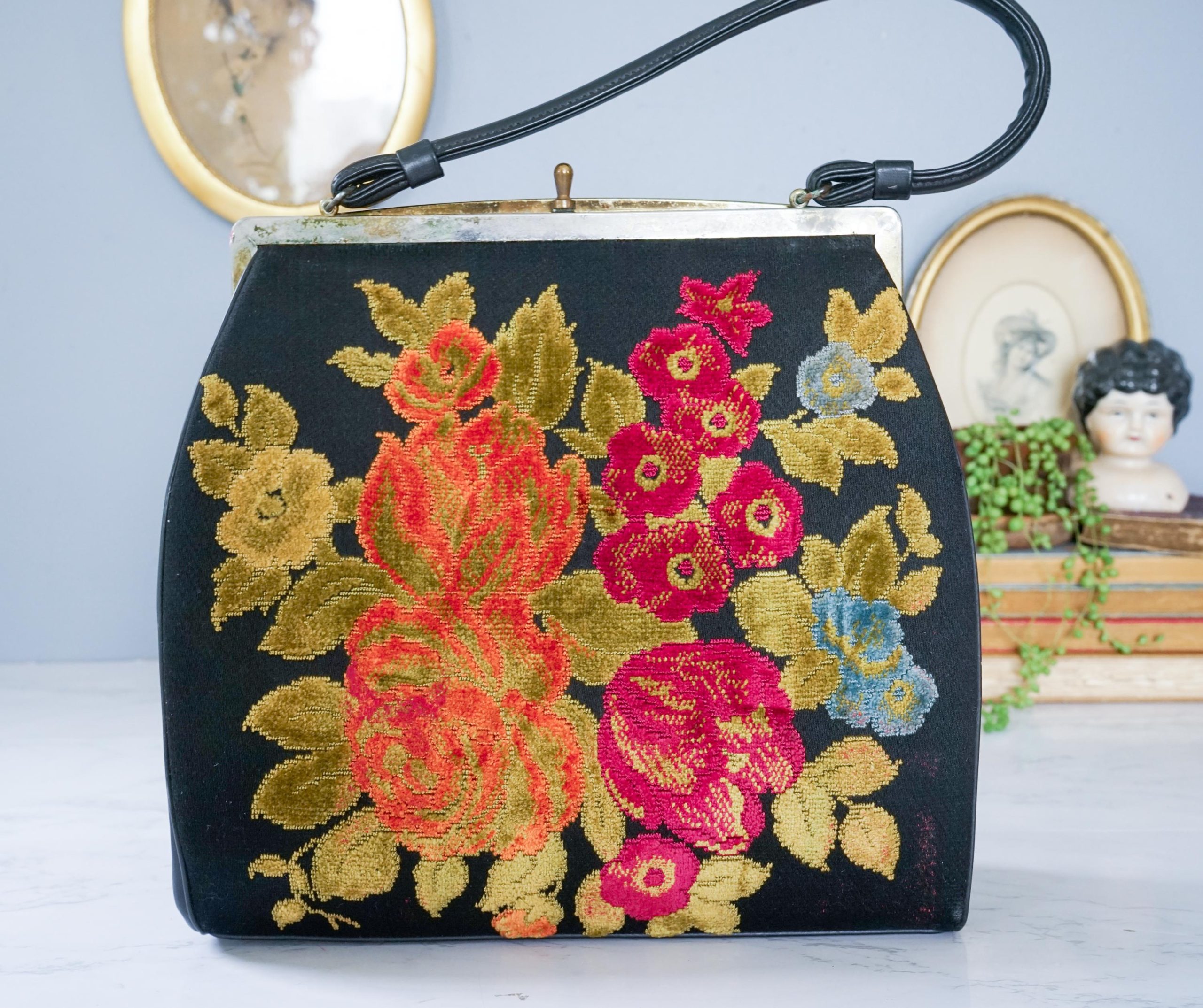 Vintage floral embroidered metal lock handbag