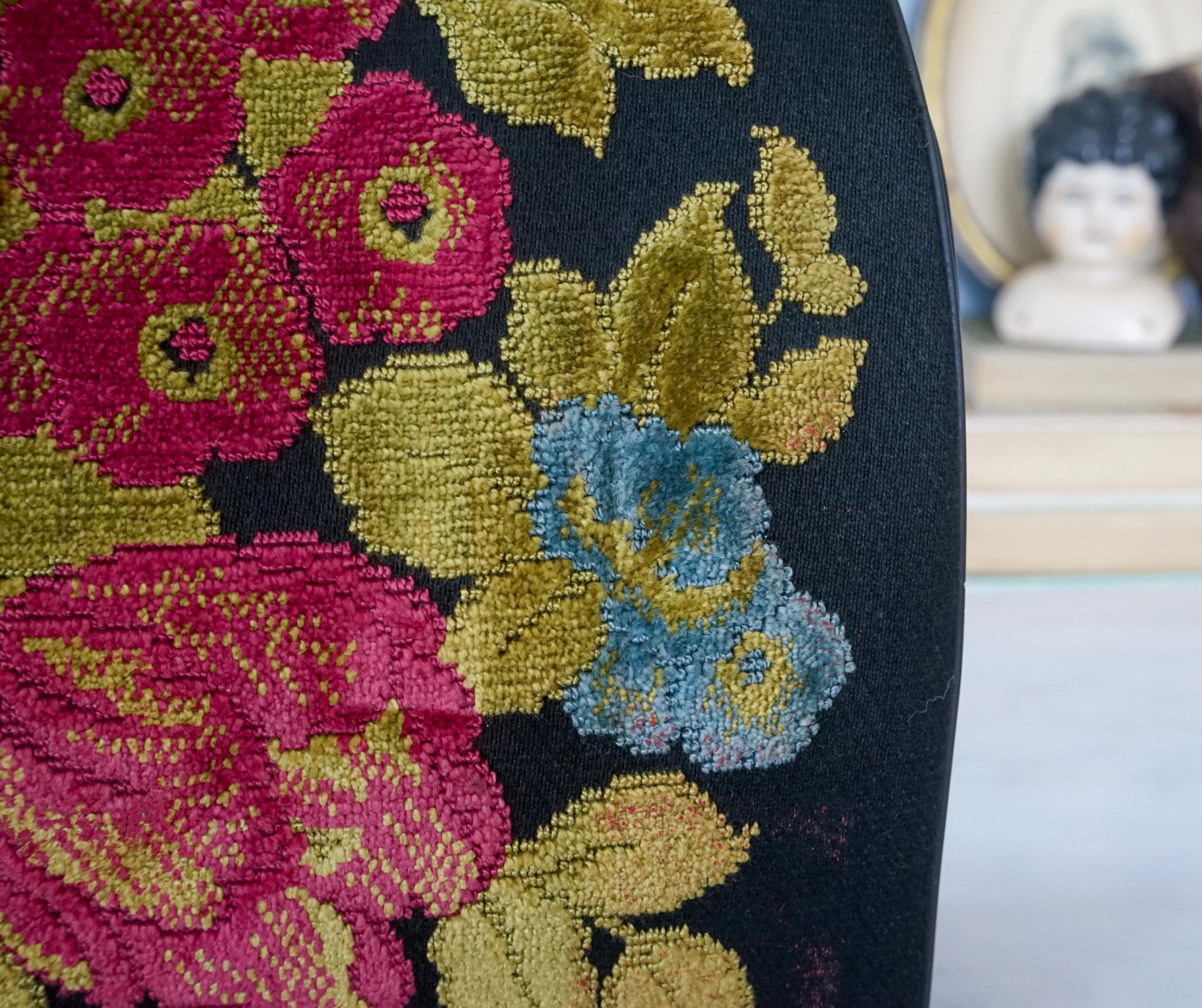 Hardware and Accessories: The bag features a vintage metal buckle for smooth opening and closing, and a sleek, textured feel. The durable black leather handle complements the embroidered design, conforming to the curves of the hand for a comfortable, vintage-inspired look.