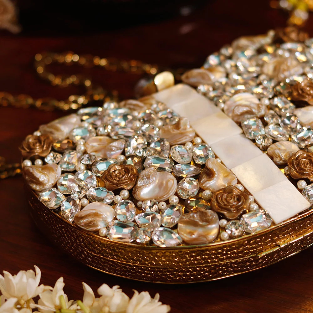 Inspired by the luxurious aesthetic of vintage jewelry and the romantic symbol of the heart, this bag seamlessly blends the brilliance of rhinestones, the softness of pearls, the iridescence of shells, and the three-dimensional texture of metal roses to create a work of art reminiscent of a “wearable love casket.” Born from a love token from a vintage palace, it imbues every banquet with a dual aura of “romantic luxury + artistic narrative,” a delicate symbiosis of fashion and emotional symbolism.