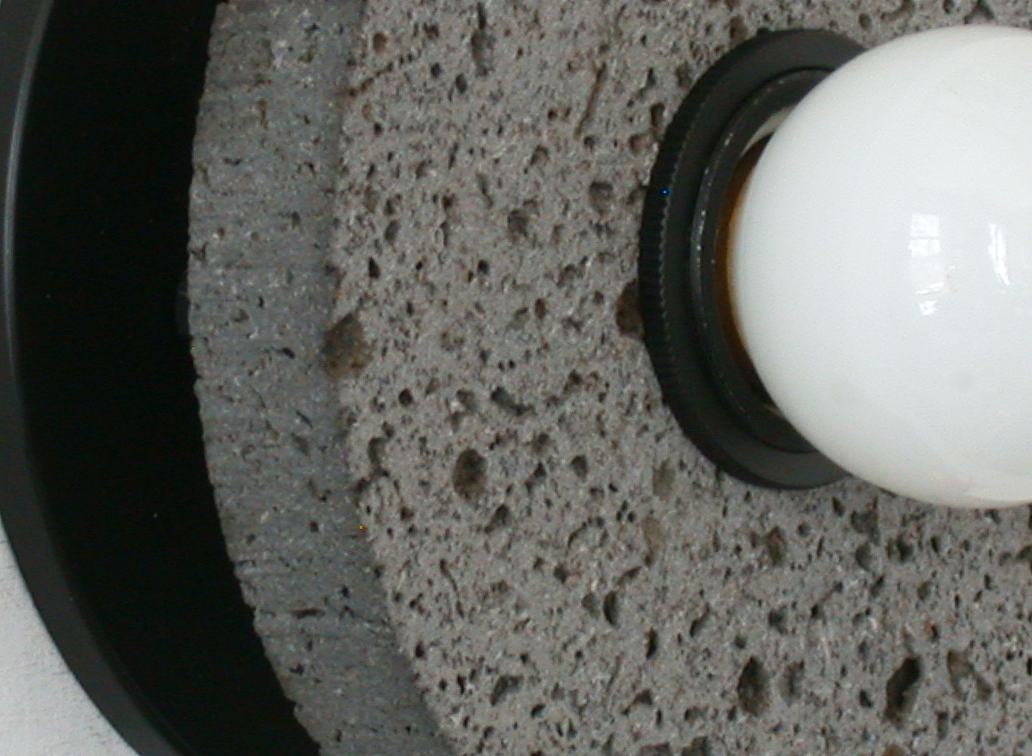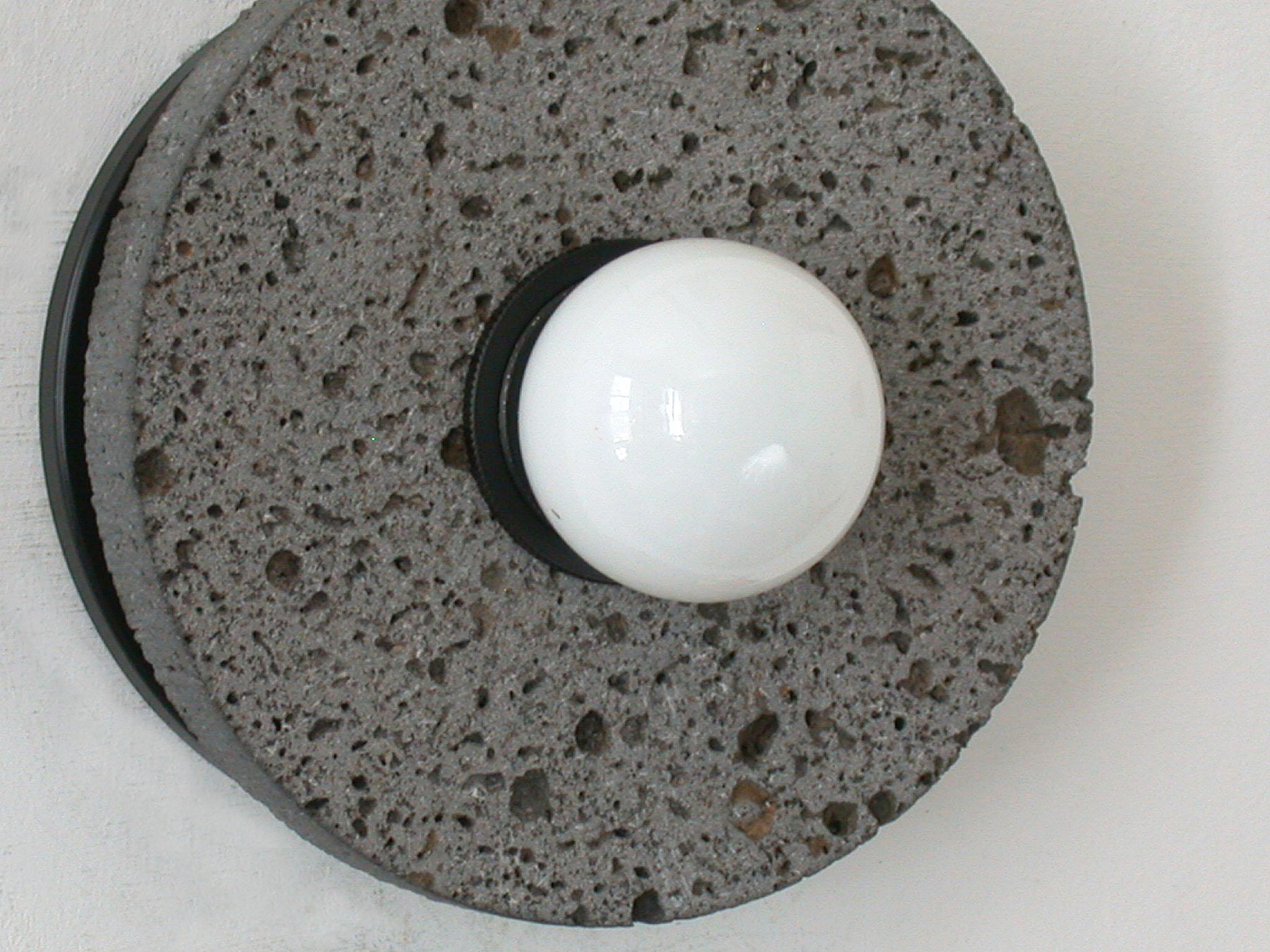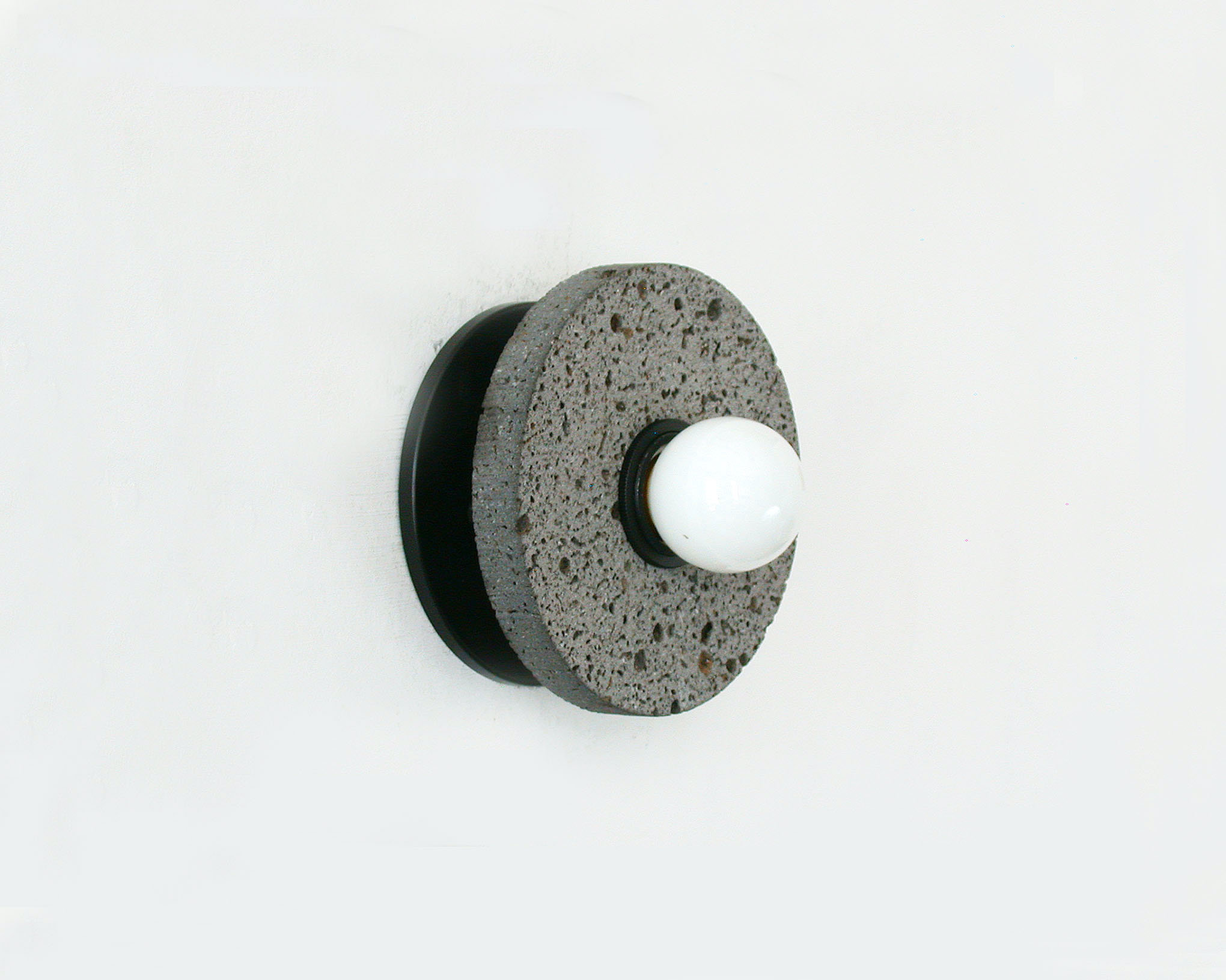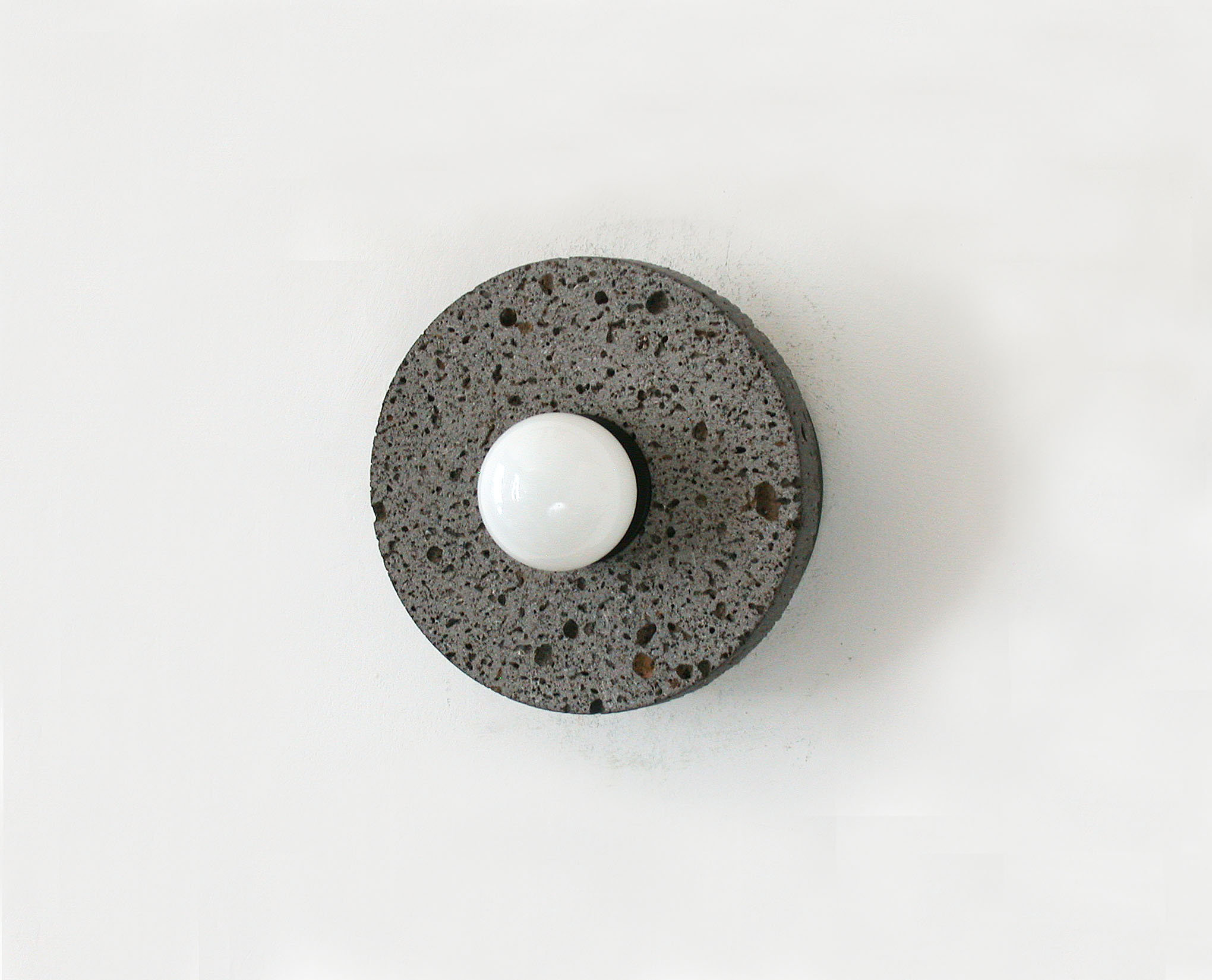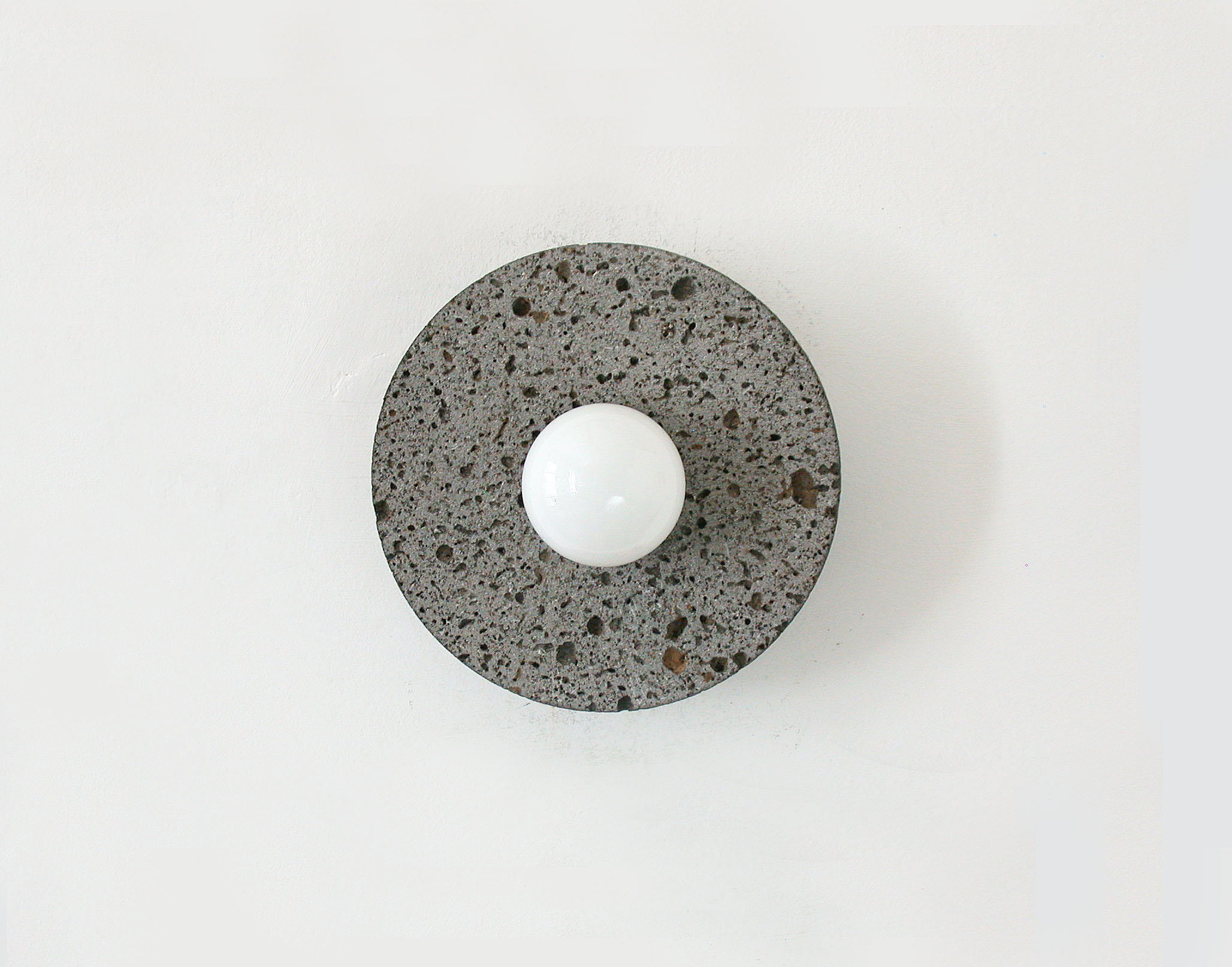 — Round volcanic stone disc with a naturally porous texture, featuring a matte black center and opaline bulb for soft, glare-free diffusion.
