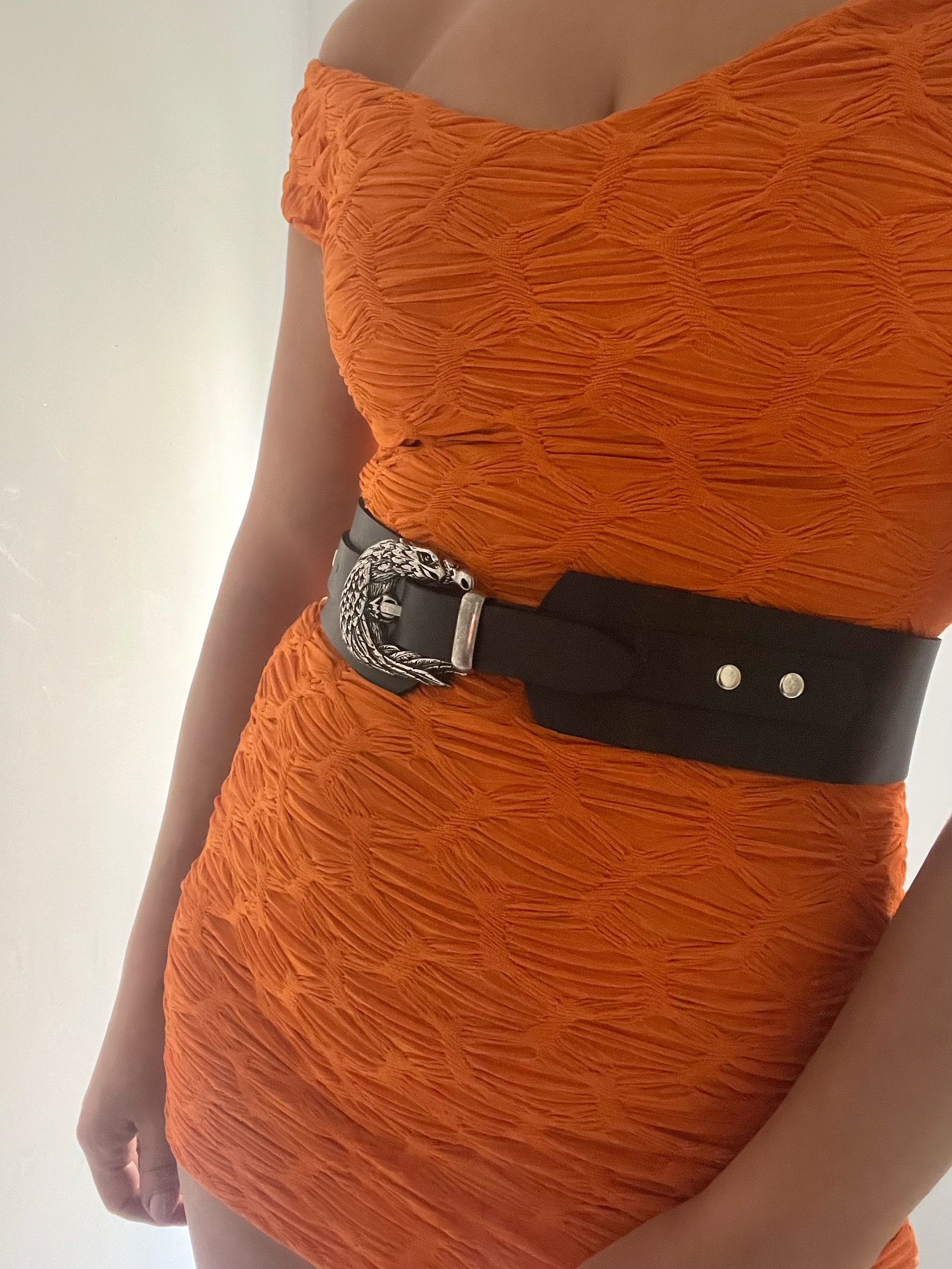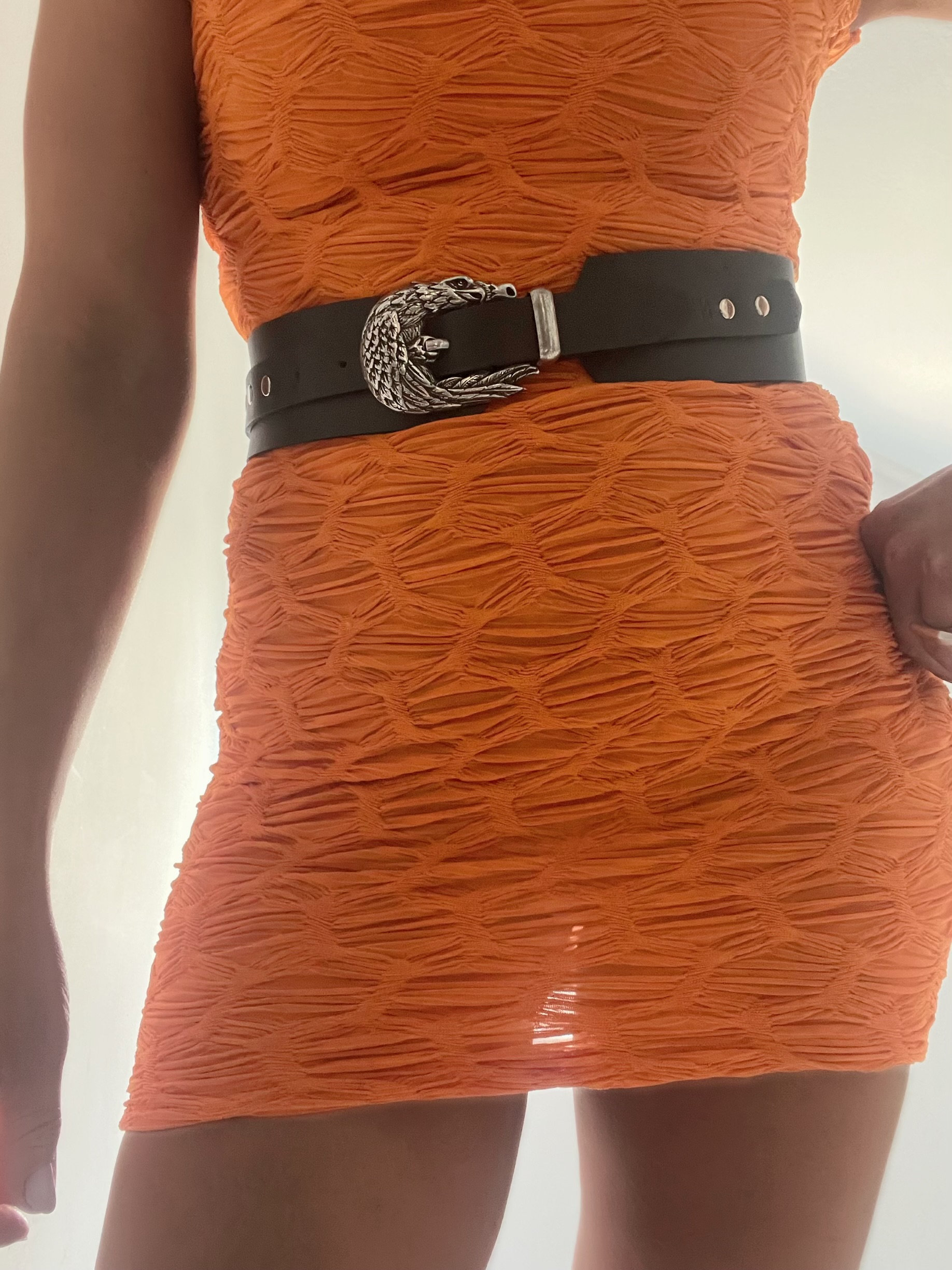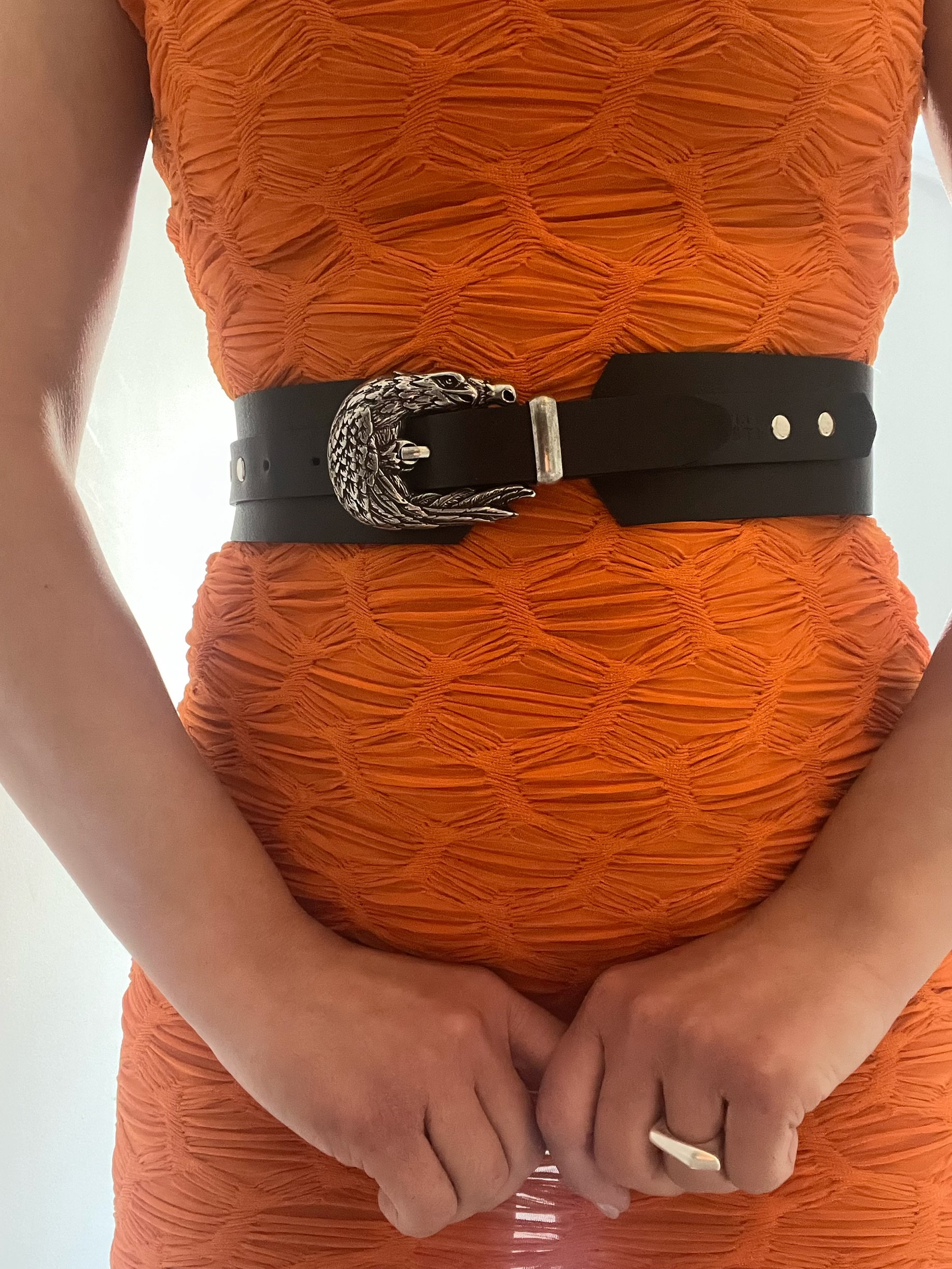 Eagle-shaped engraved buckle and wide belt for a cool look: The core design features a three-dimensional eagle buckle and a wide black belt. The eagle buckle is the focal point, juxtaposing the wildness of Western retro with the effortless luxury of silver jewelry. The wide belt effectively cinches the waistline (as shown when paired with an orange pleated skirt, it instantly defines the figure and enhances the look of vibrant colors). The striking contrast between black and orange elevates the belt from an accessory to a centerpiece, effortlessly accommodating high-saturation outfits.