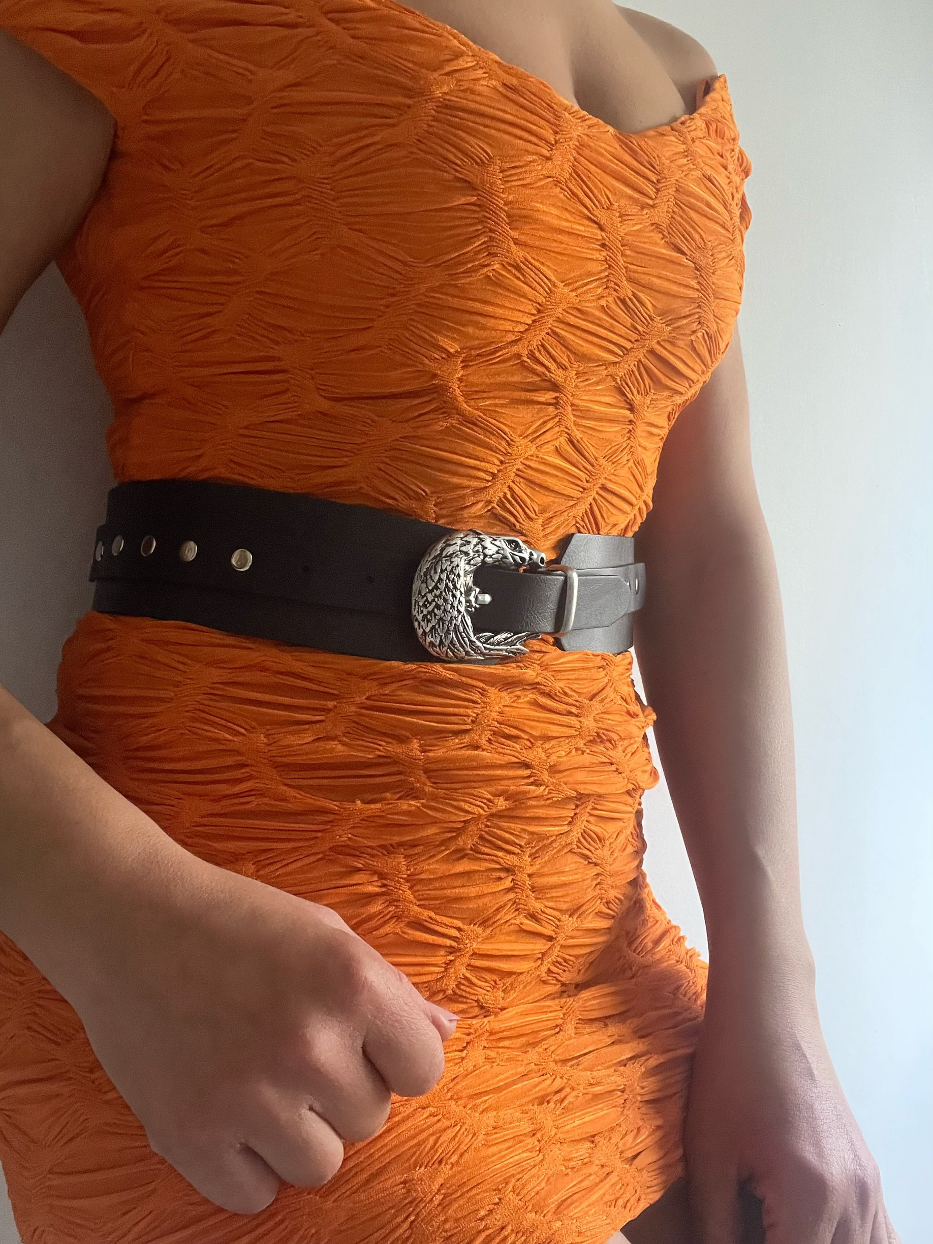 Color-blocking Eye-Catching Style: Paired with an orange pleated skirt (as shown), a wide black belt neutralizes the boldness of the high-saturation color. The vintage silver accents of the Eagle Buckle add a touch of effortless luxury to the vibrant look, making it an easy focal point at parties, art exhibitions, and more.