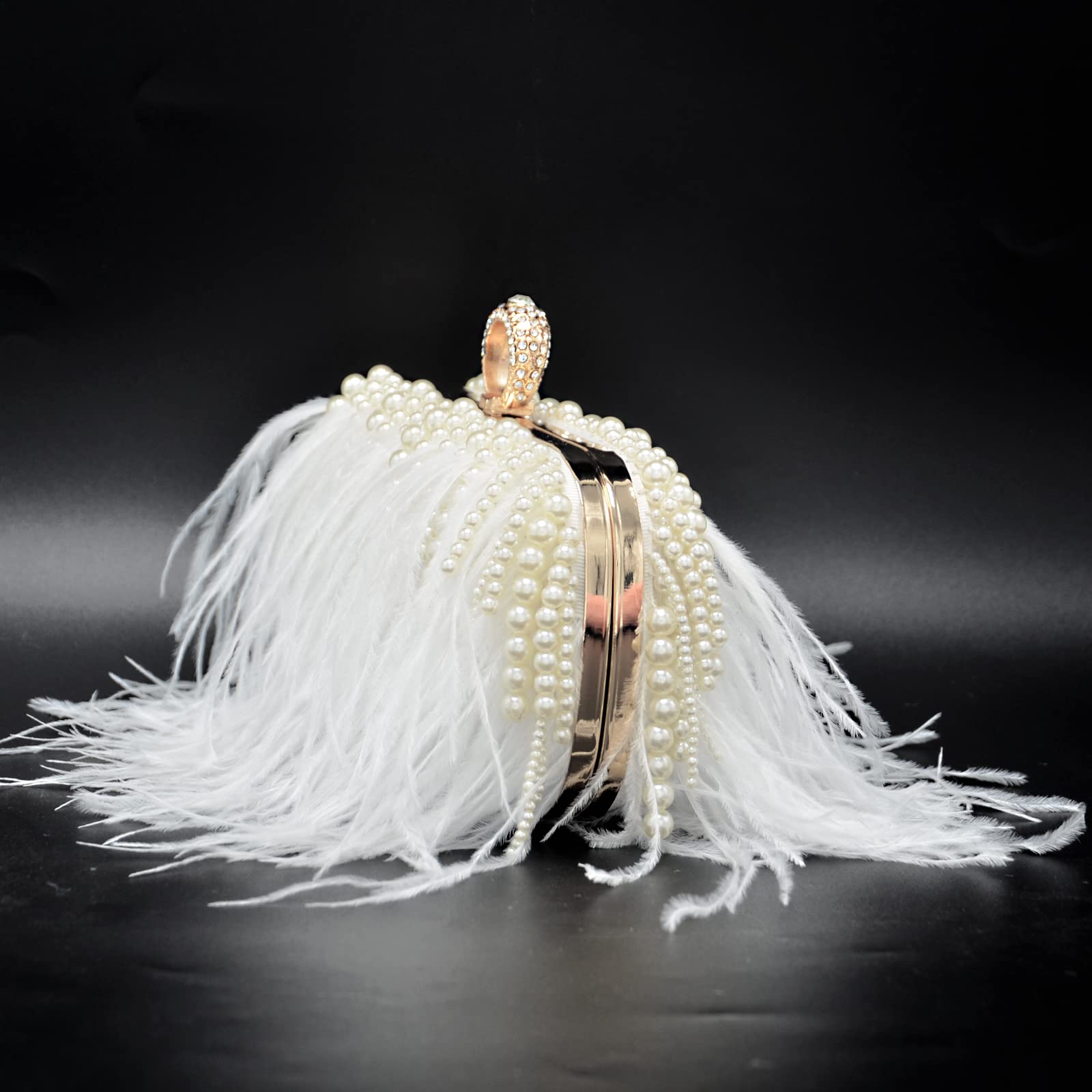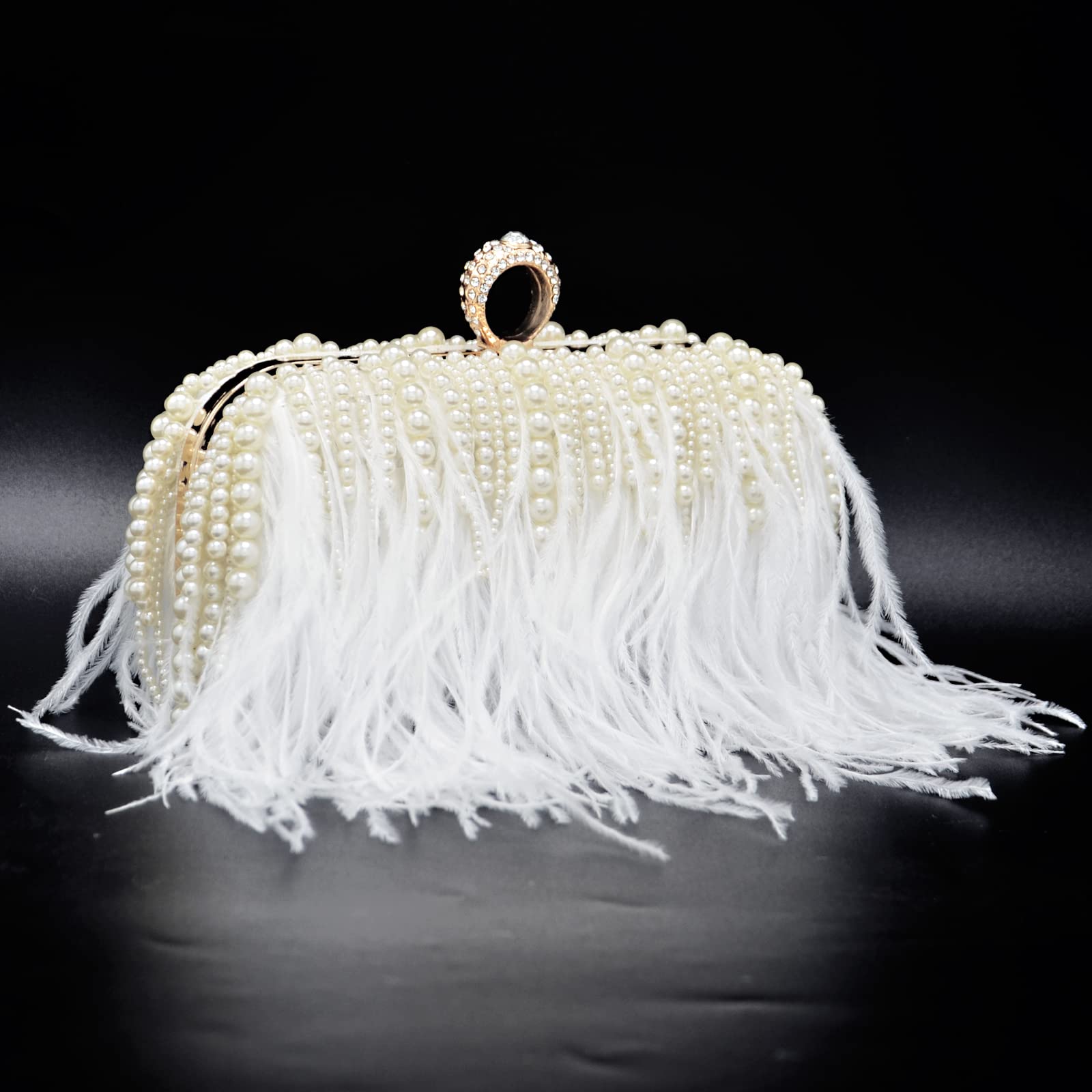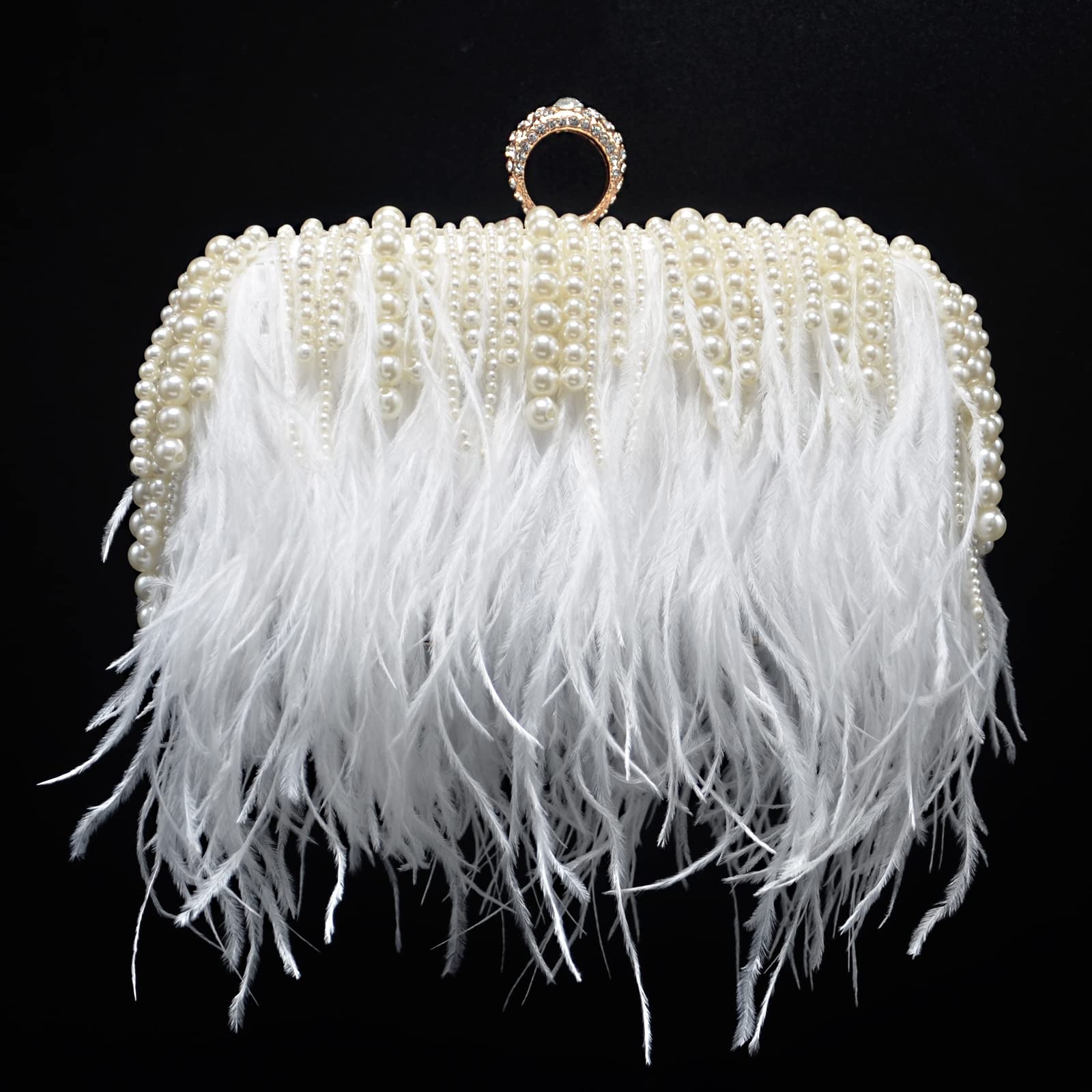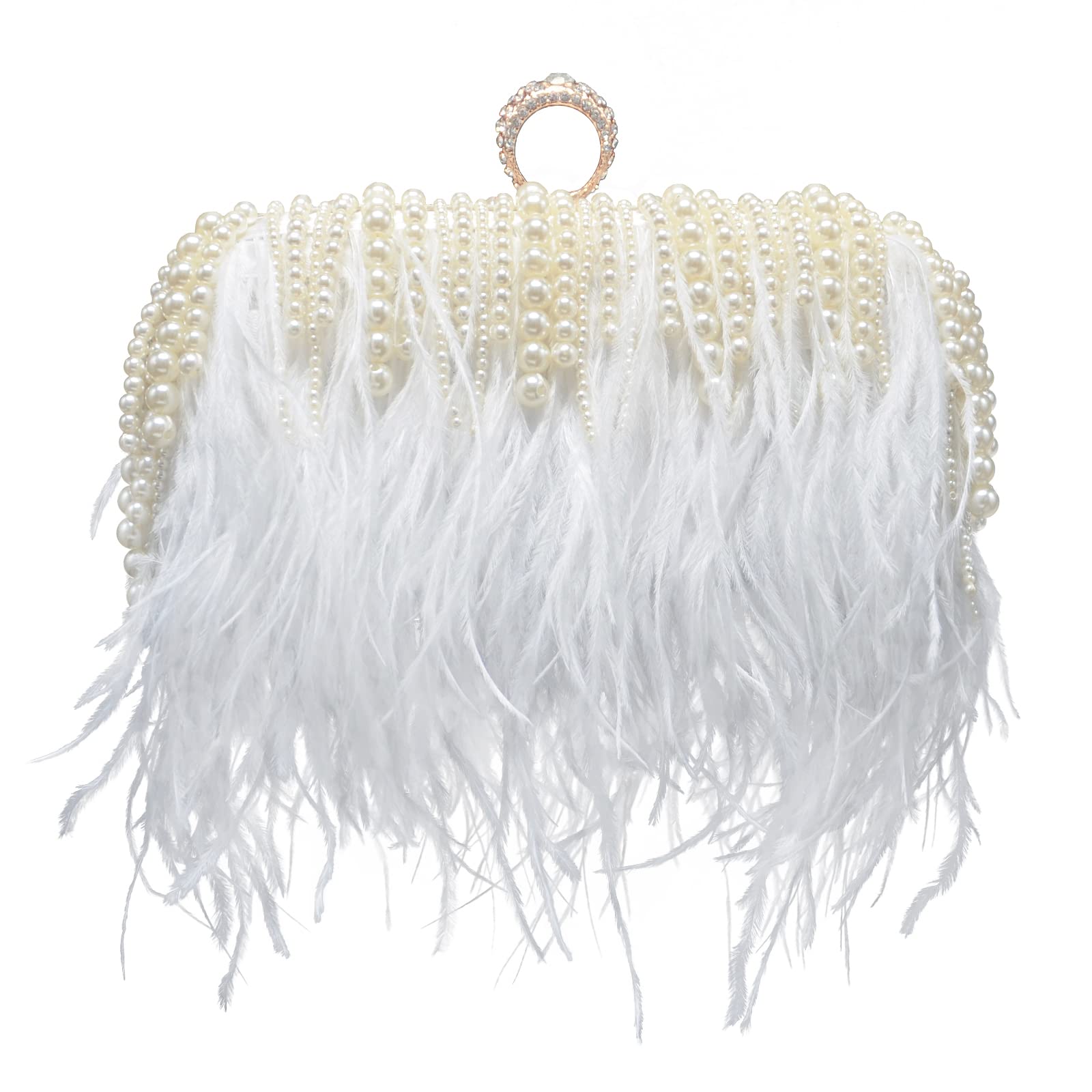 Soft, glamorous, and made to stand out, this evening clutch features flowing white feather fringe paired with elegant pearl accents for a luxe, bridal-ready look. The structured silhouette keeps it polished, while the sparkling ring handle adds a jewelry-like finishing touch—perfect for weddings, parties, dinners, and special nights out.