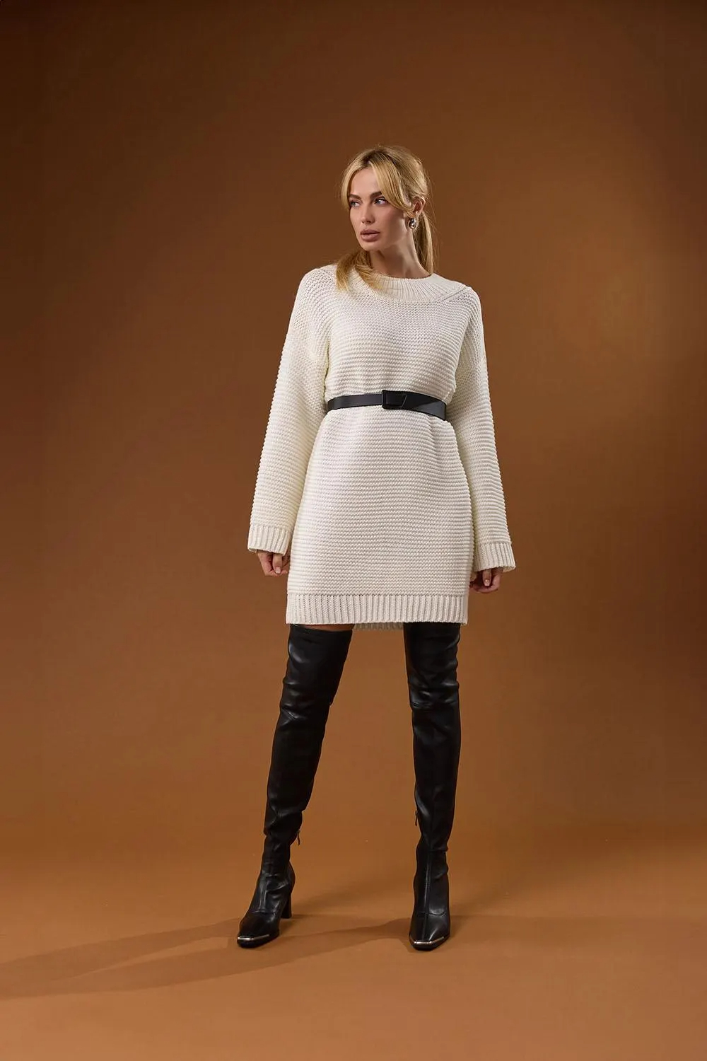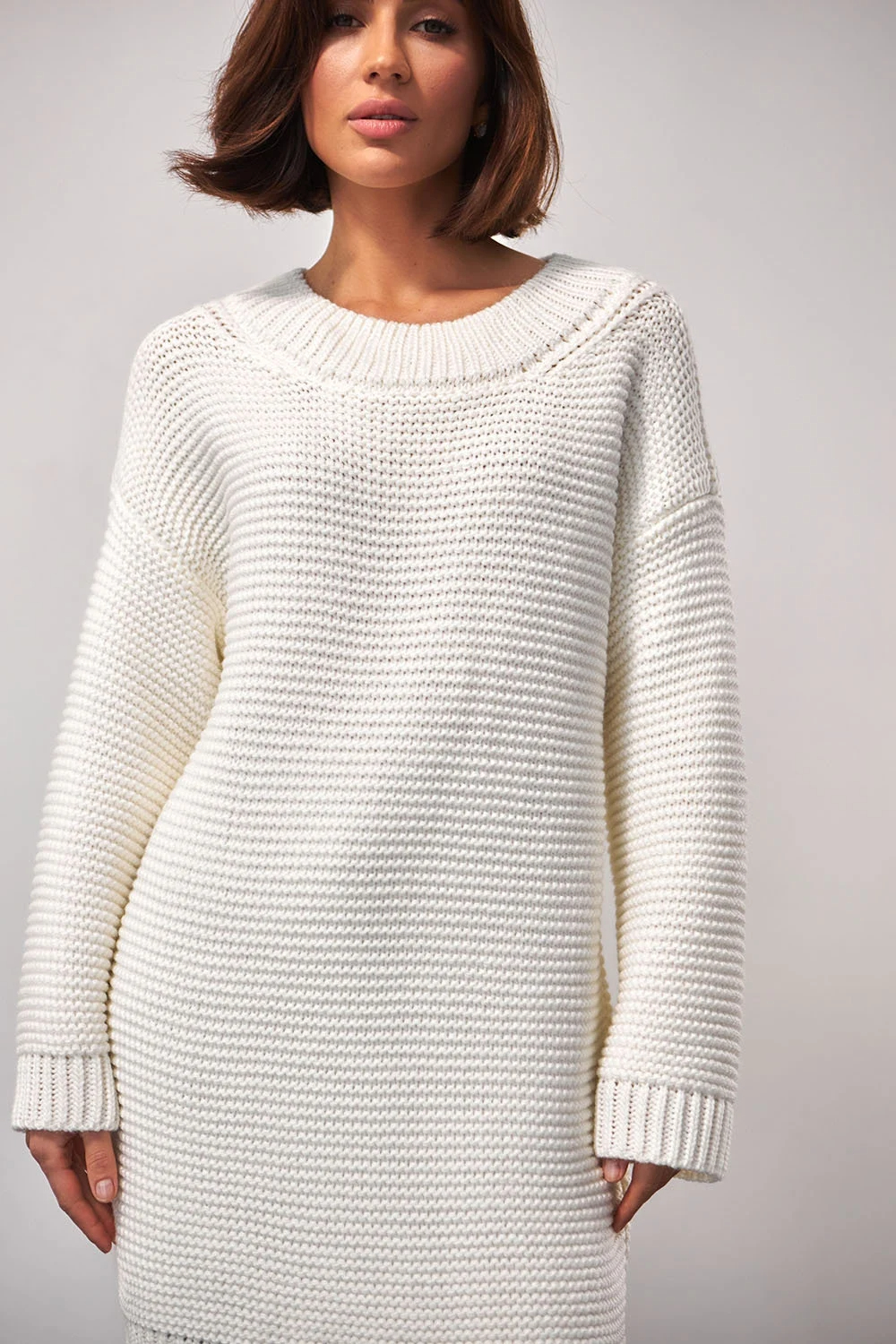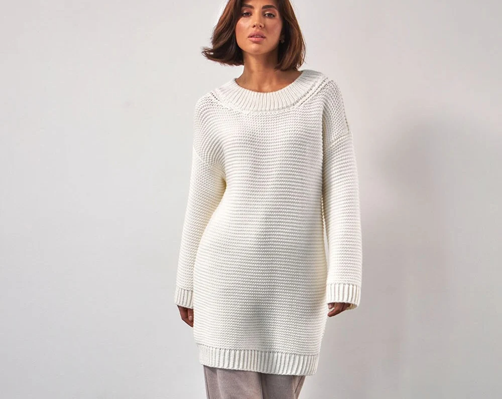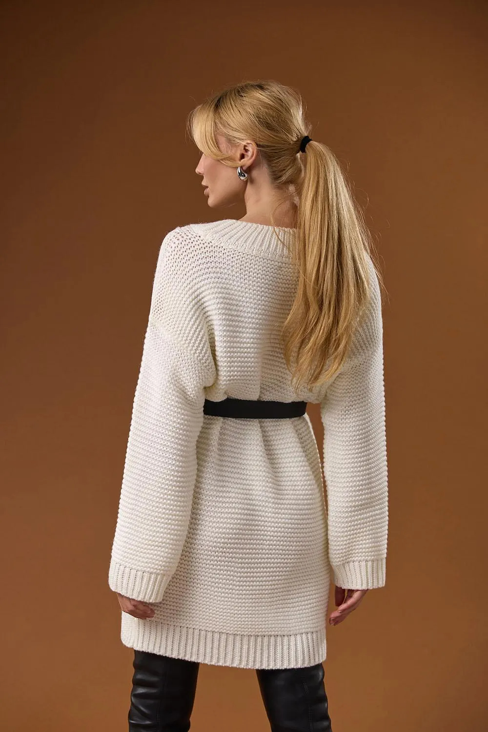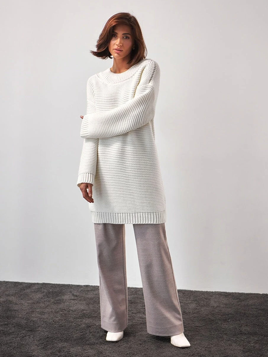 This white longline knit sweater features a clean minimalist design with a soft, cozy feel that makes it an easy choice for everyday wear. The crisp white tone gives it a fresh and refined look, while the extended length adds modern comfort and relaxed elegance. Its understated silhouette makes it a versatile staple for cooler seasons.