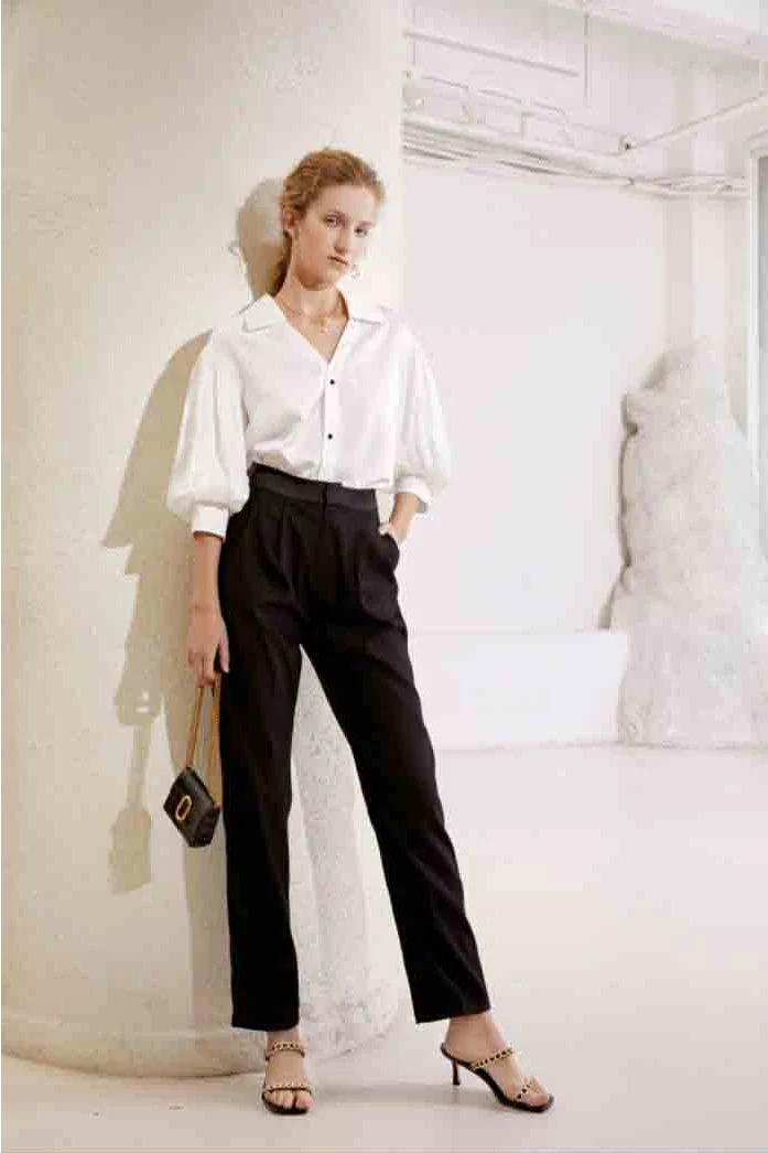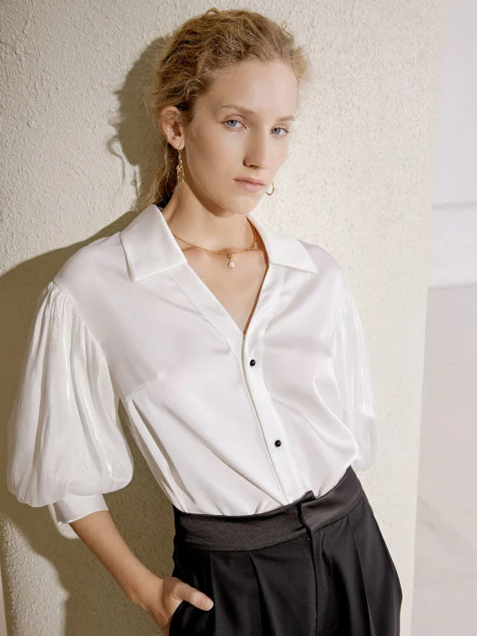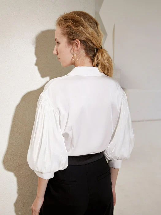 This white puff-sleeve blouse is simple and clean-cut, understated yet sophisticated, infusing a modern twist on a classic shirt. The crisp collar and button-down placket maintain a clean silhouette, while the flared three-quarter sleeves add a sculpted elegance. Crafted from a soft, draping woven fabric, it combines refinement and comfort, making it ideal for weekdays, city strolls, or any occasion where you want to project elegance without being overly contrived.