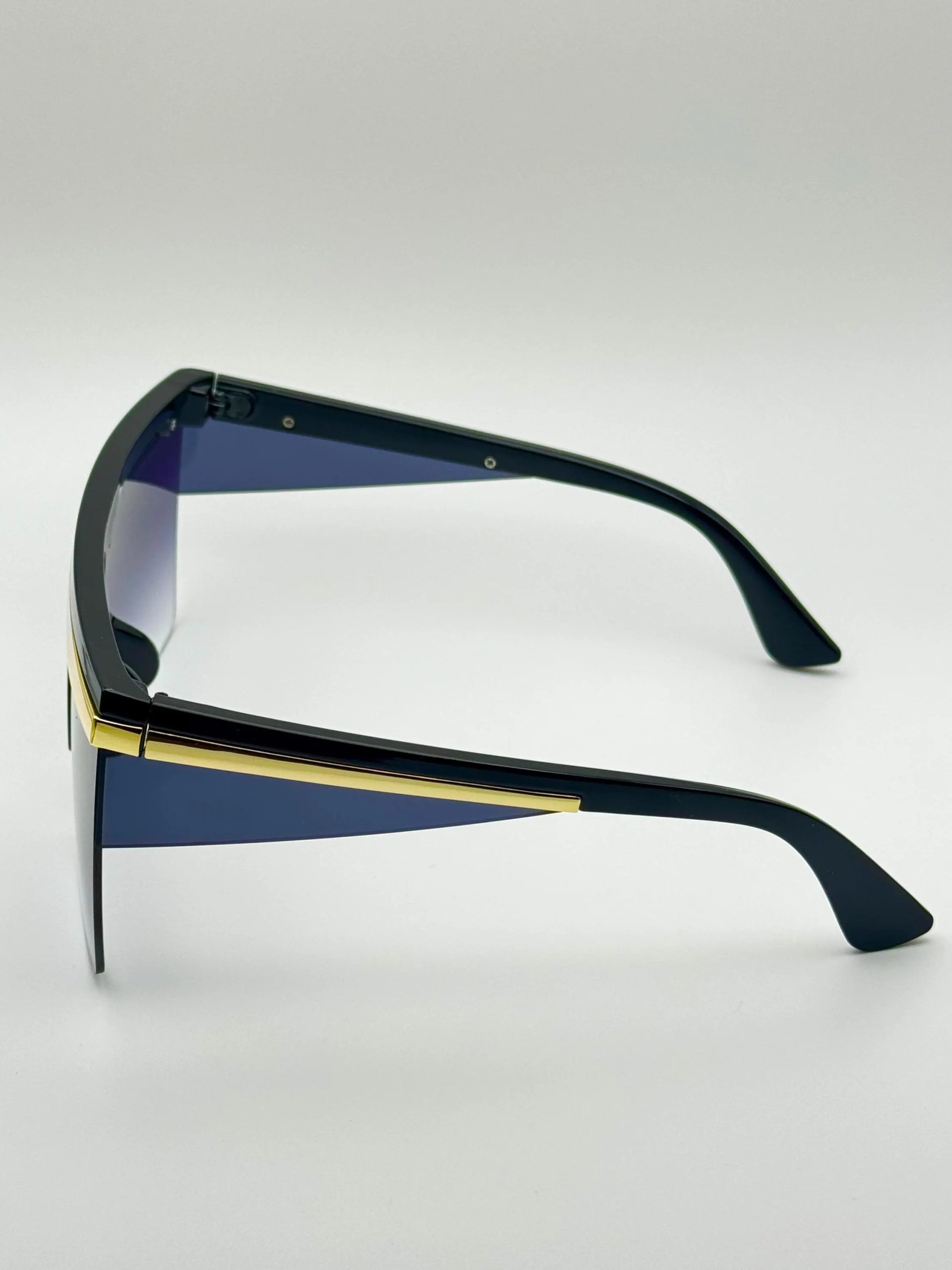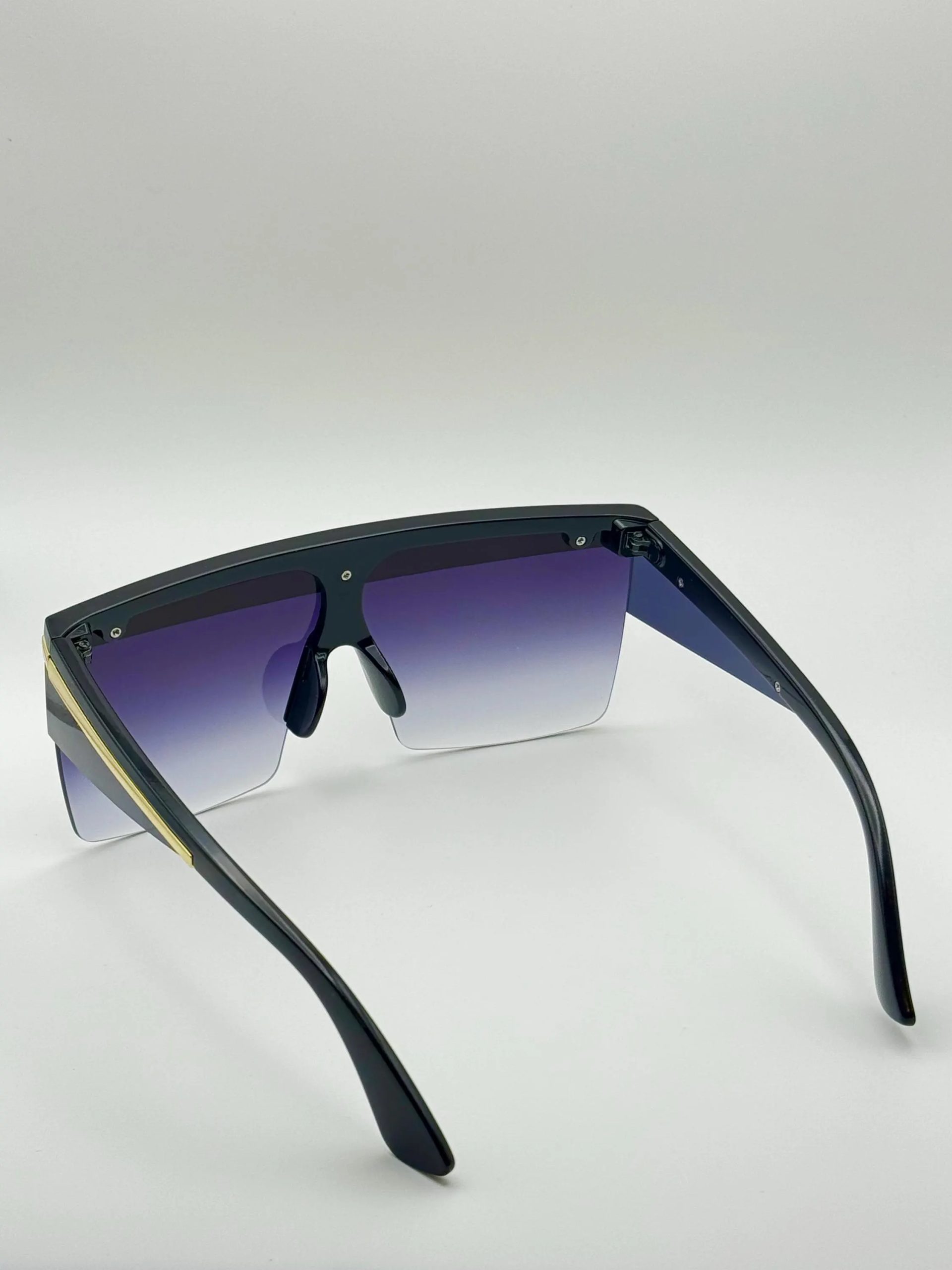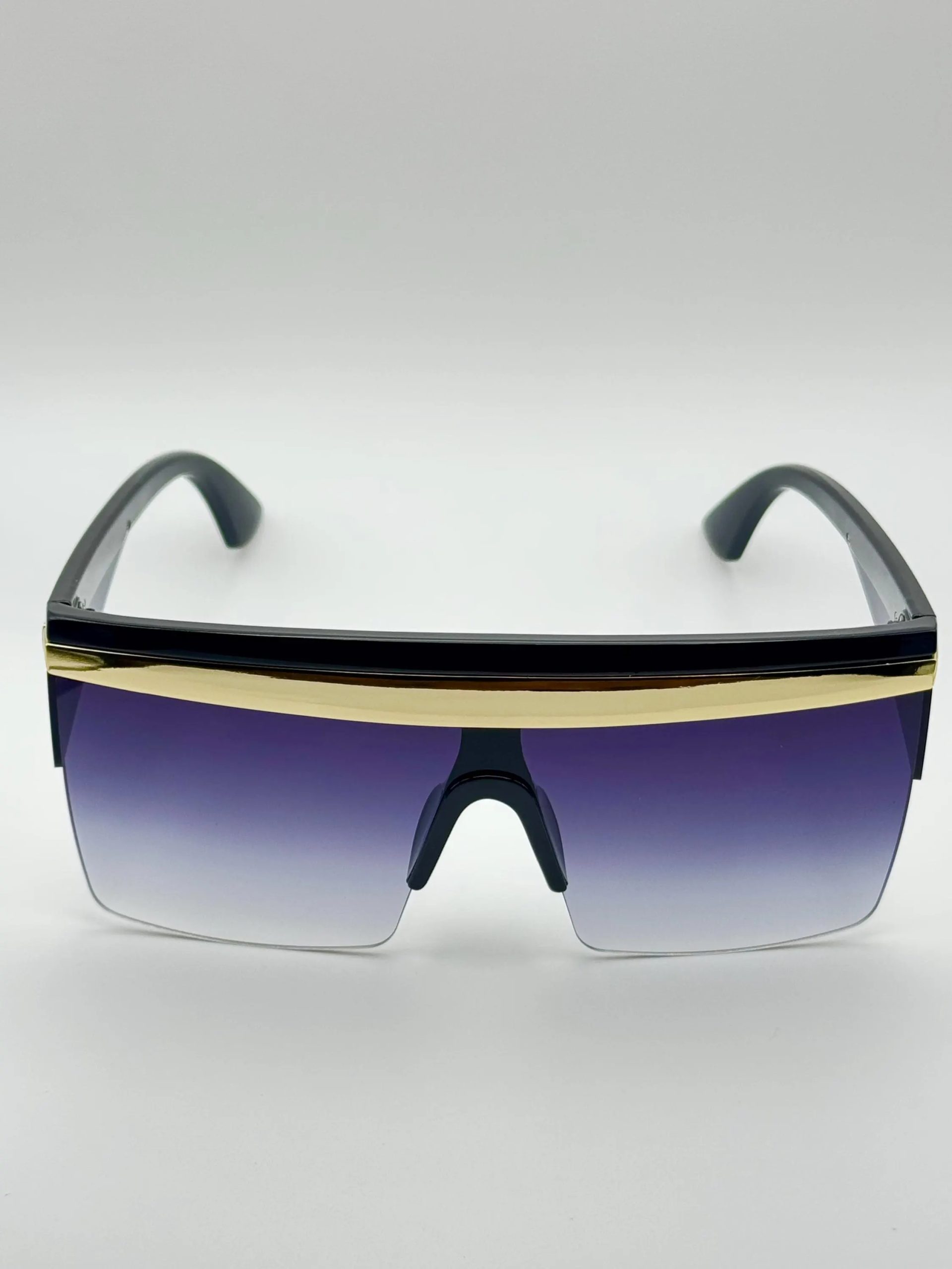 These are wide-rimmed sunglasses that exude a “powerful, futuristic vibe.” The core design features a striking black and gold color-blocked wide frame and gradient purple frameless lenses. The ultra-wide frame creates a strong visual impact, aligning with the trend of “large frames flattering the face.” The black frame paired with gold trim creates a sophisticated color contrast, softening the heaviness of the wide frame while injecting a touch of understated luxury. The gradient purple lenses transition from a clear light purple to a deep dark purple, providing excellent sun protection in strong light and maintaining visual clarity in low light, making them suitable for outdoor high-light scenarios while adding a “cool and sophisticated” feel to any outfit. It’s a key accessory for creating a “street style” and “mature yet chic” look—the wide frame narrows the face, the black and gold color-blocking enhances the sophistication, and the gradient purple lenses add a cool and sophisticated touch, easily making you the visual focus of your outfit.