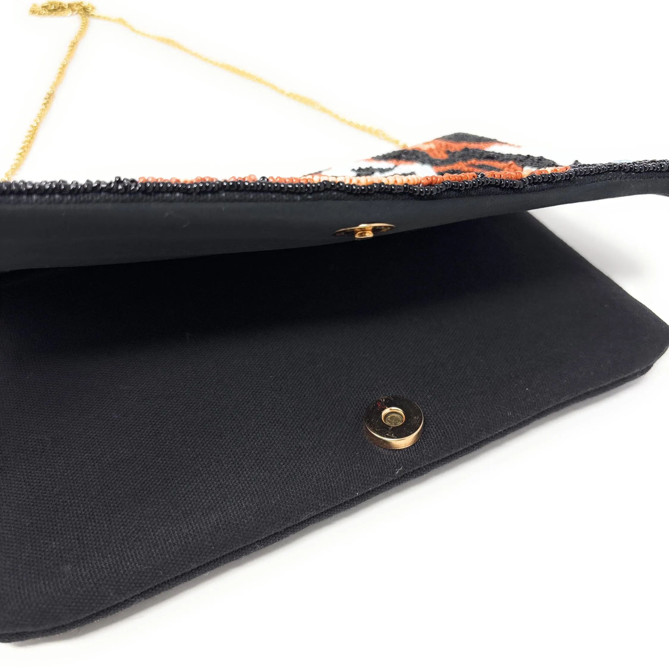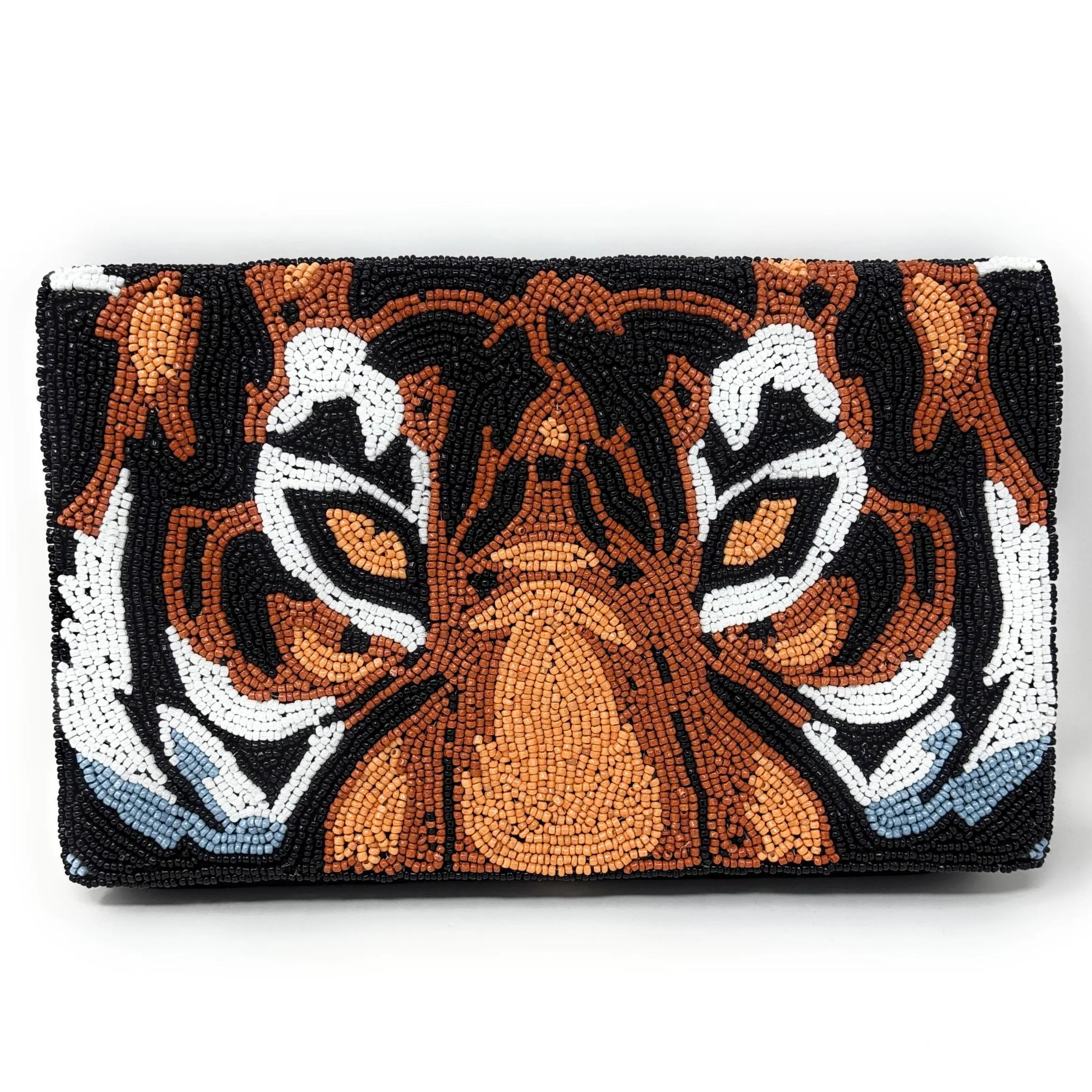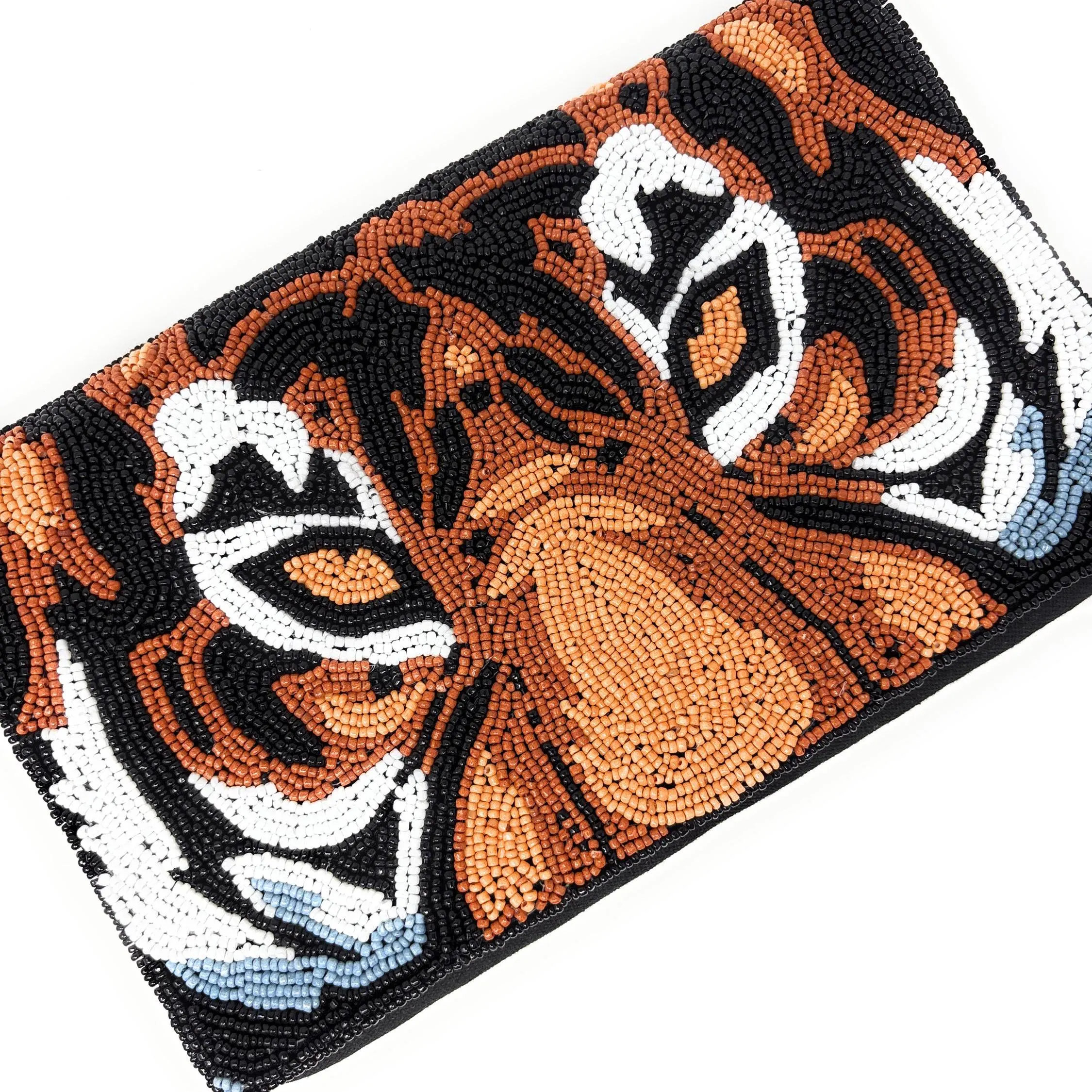 The design centers around the wild totem of a tiger’s head. Against a black background reminiscent of a dark night, brown and white beads precisely outline the tiger’s stripes and eyes, bringing the beast’s majesty and power to life through hand-beaded detailing. This fusion of street chic, vintage nostalgia, and handcrafted artistry makes it a truly eye-catching statement for trendsetters and those embracing a wild style, creating a uniquely ferocious aura.