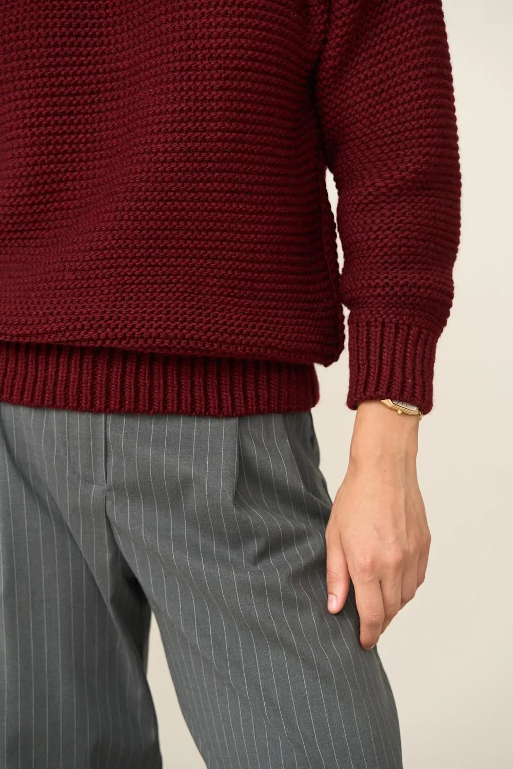This burgundy turtleneck sweater features a refined textured knit design with a warm, elegant look. The rich burgundy shade adds depth and seasonal charm, making it a versatile staple for fall and winter wardrobes. Its clean silhouette offers a polished appearance while still feeling relaxed and easy to wear.