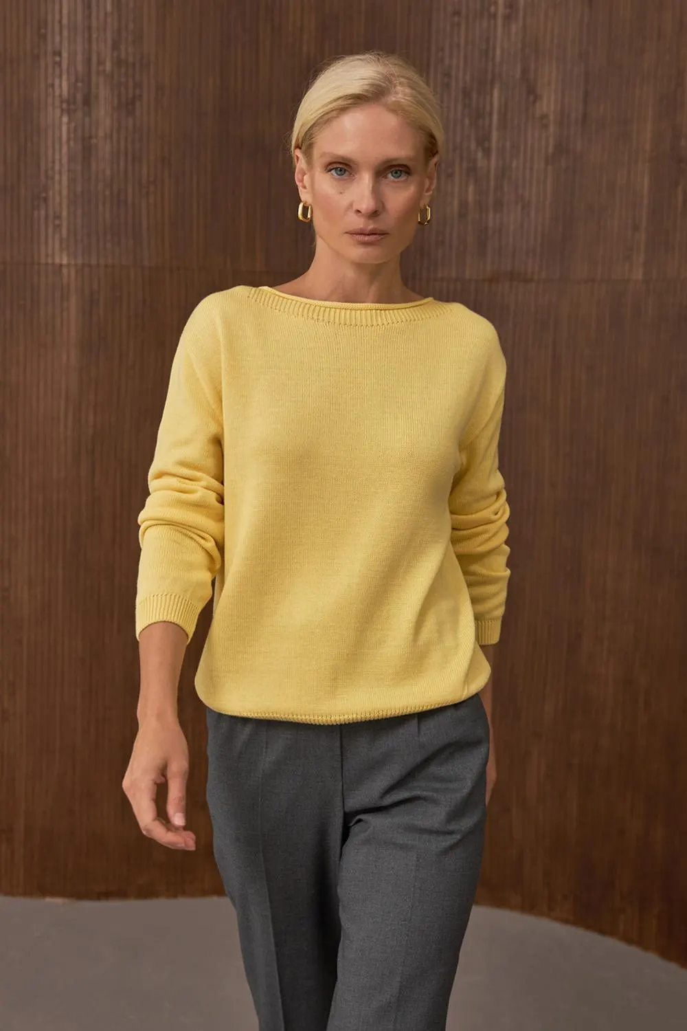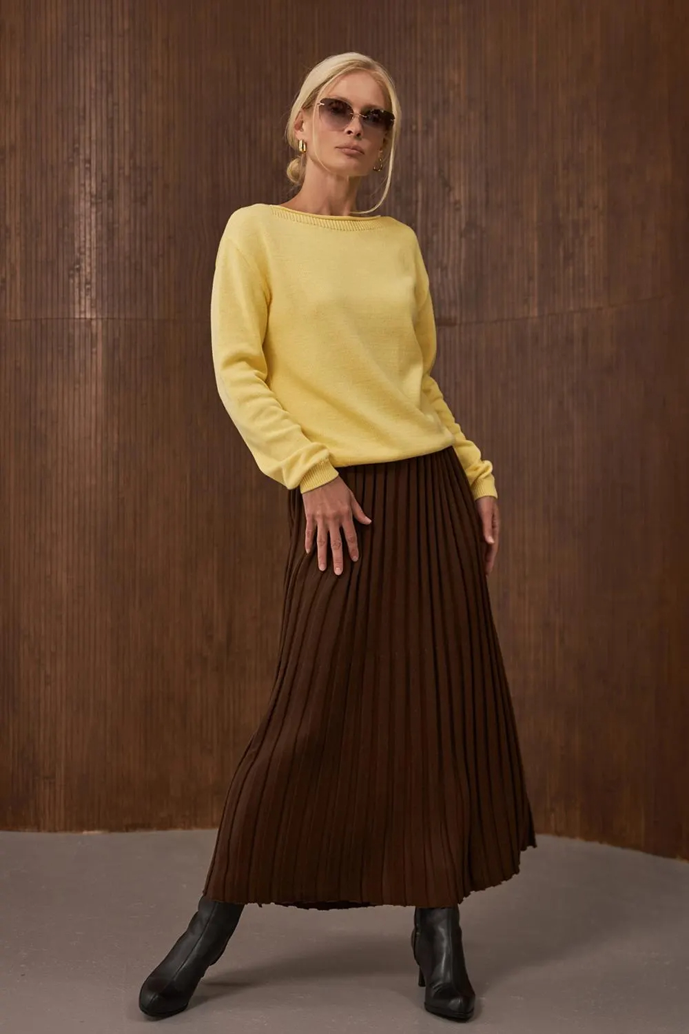 Designed with long sleeves and a relaxed fit, this sweater offers all-day comfort without appearing bulky. The ribbed neckline, cuffs, and hem add subtle structure and help maintain the shape of the garment. The light yellow shade adds warmth and brightness to the outfit, pairing beautifully with pleated skirts, tailored trousers, or casual denim for both polished and effortless styling.