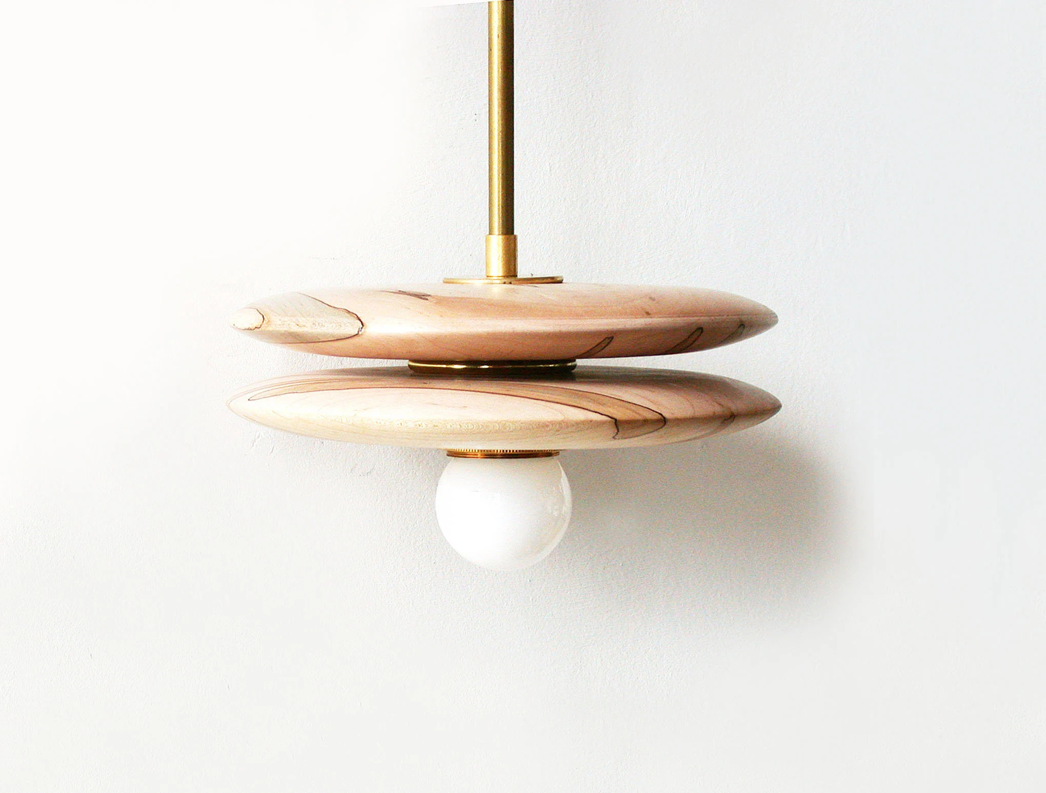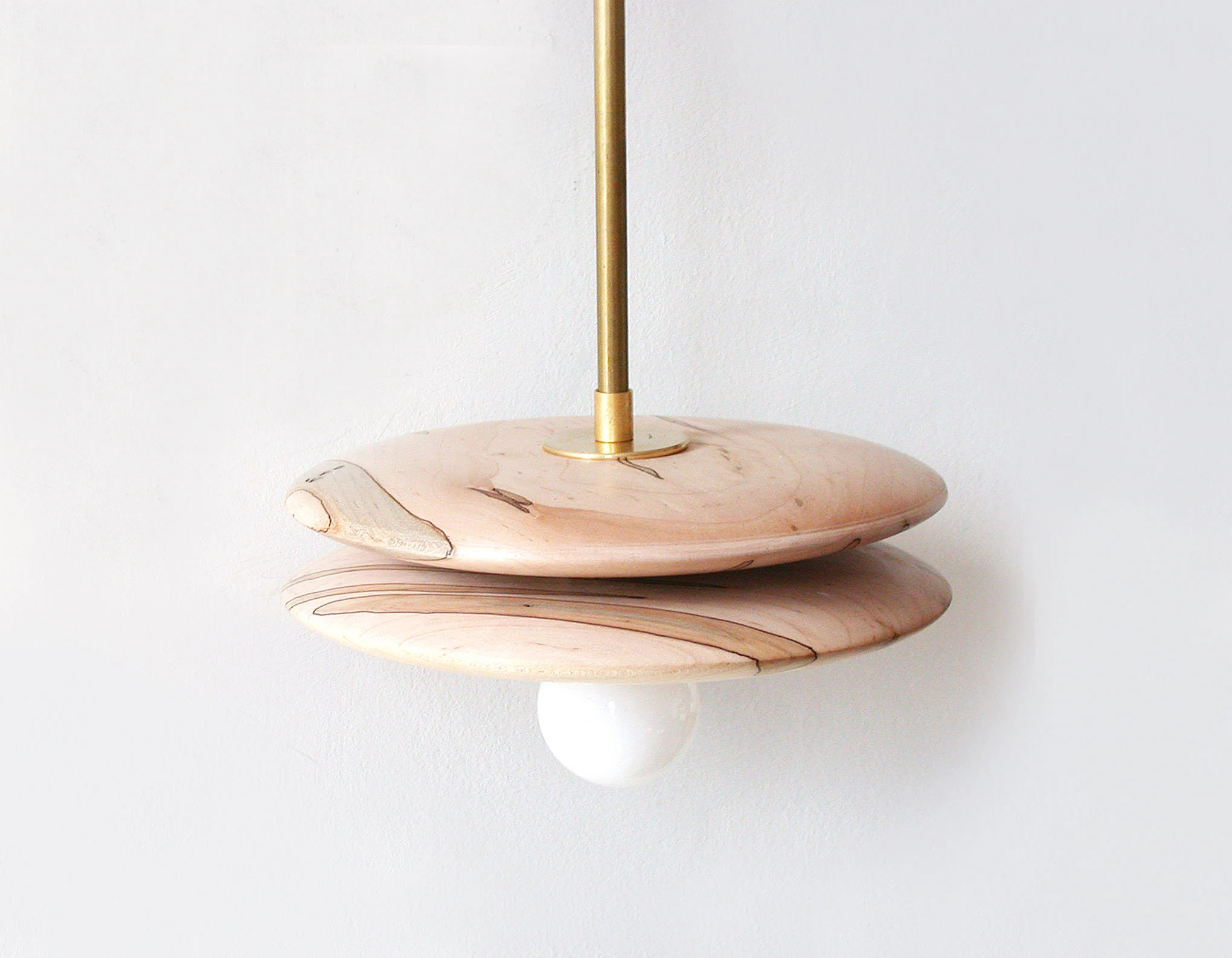 — A rounded wooden back panel, paired with a slender brass stem, suspends two tiers of wood-grained discs, each decorated with an opaline bulb, creating a soft, glare-free downlight effect.