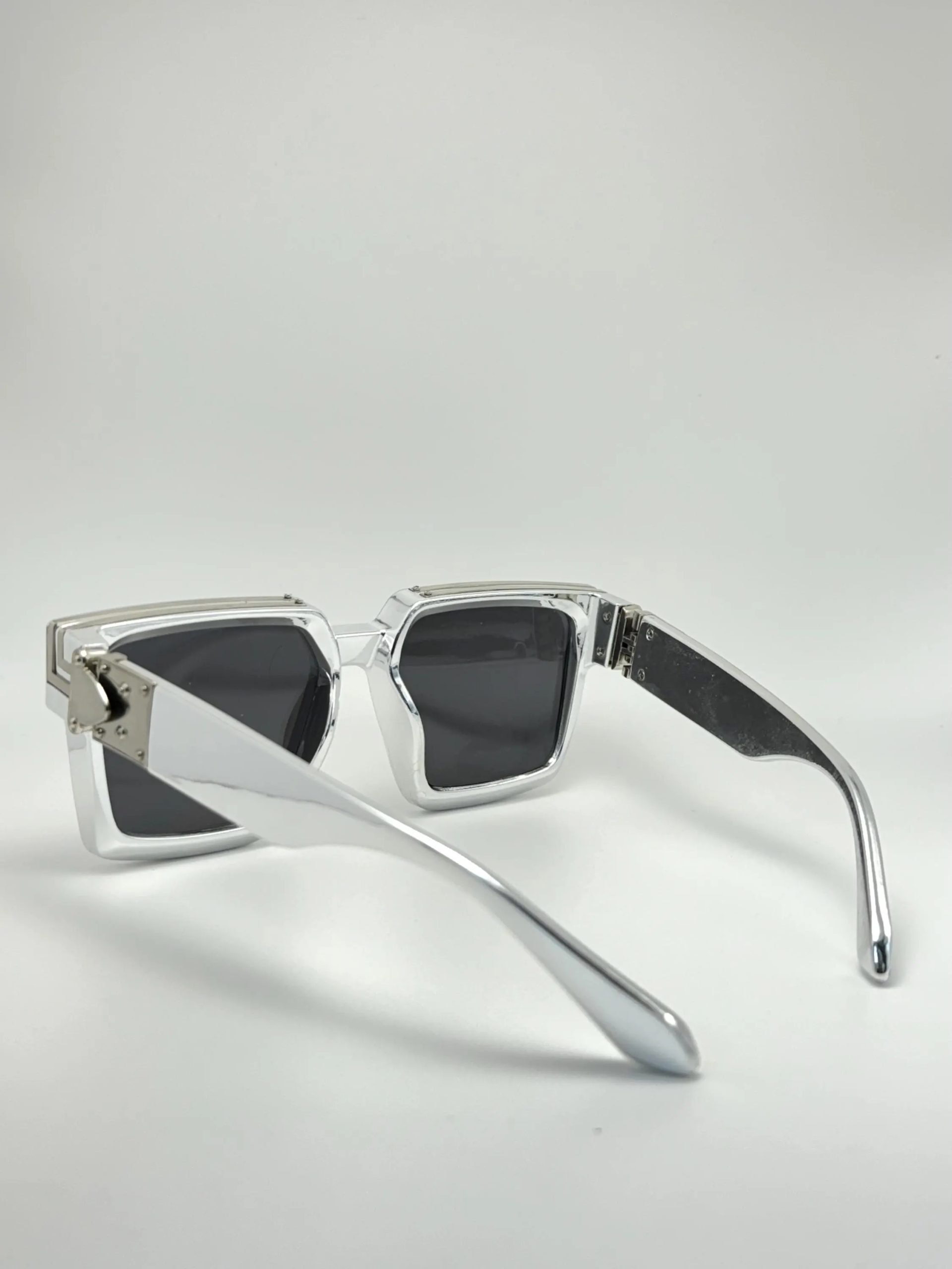These are oversized square-frame sunglasses that emphasize a “Y2K retro-futuristic cool” feel. The core design features a glossy silver thick frame, dark gray full-light lenses, and decorative details on the temples. The exaggerated square silhouette creates a strong visual impact, perfectly matching the “eye-catching and exaggerated” tone of the Y2K style. The glossy silver frame undergoes a high-gloss polishing process, giving it a high-gloss texture under light, while the decorative details on the temples enhance the futuristic look. The dark gray full-light lenses are suitable for bright light conditions and add a cool and edgy touch to the overall style. It’s not only a practical item for summer outdoor sun protection but also a “focal point accessory” for Y2K and street style looks—the large frame flatters facial features (softening cheekbones and widening the jawline), while the glossy silver finish adds a trendy touch, easily making it the most eye-catching element in any outfit.