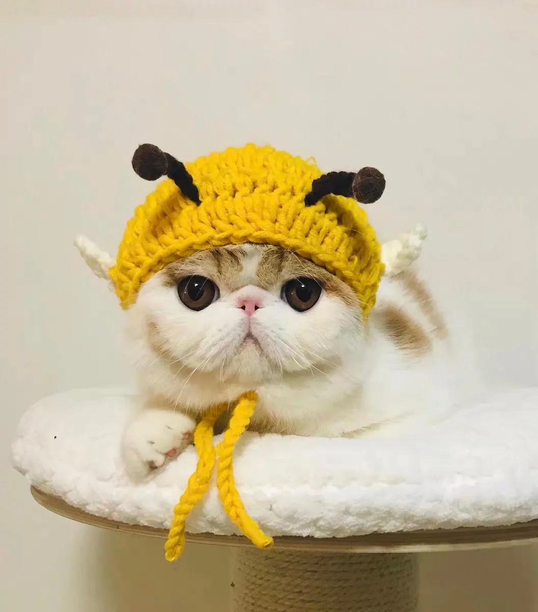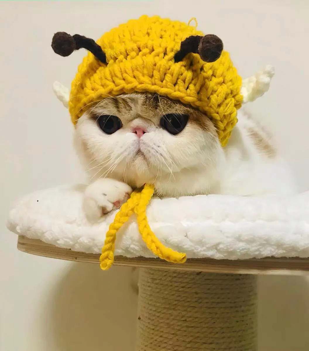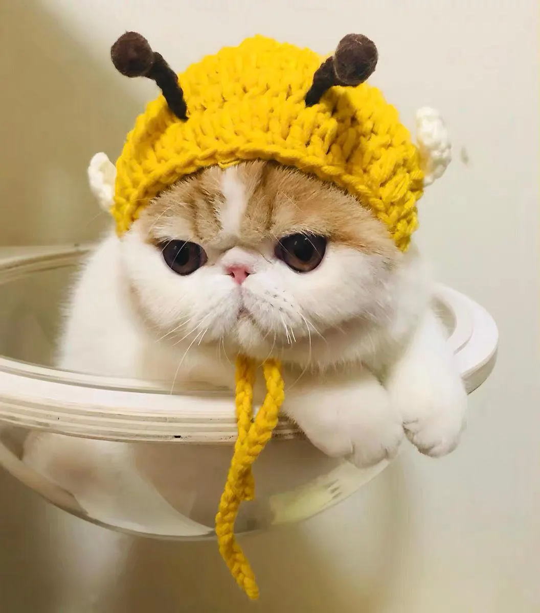 The headdress’s design revolves around “fitting a flat-faced cat and amplifying its adorable charm,” with every detail hitting the mark: The bee-shaped hat perfectly fits the flat-faced cat’s skull: The warm yellow crochet body perfectly conforms to the curves of a flat-faced cat’s skull, with ample space on both sides for the ears. It won’t press down on the cat’s natural ears, allowing them to freely move their ear tips to perceive their surroundings without any feeling of restriction or constriction. The elastic crochet edge at the brim fits snugly around the cat’s head, preventing it from slipping or constricting, making it suitable for cats with various face and head shapes.